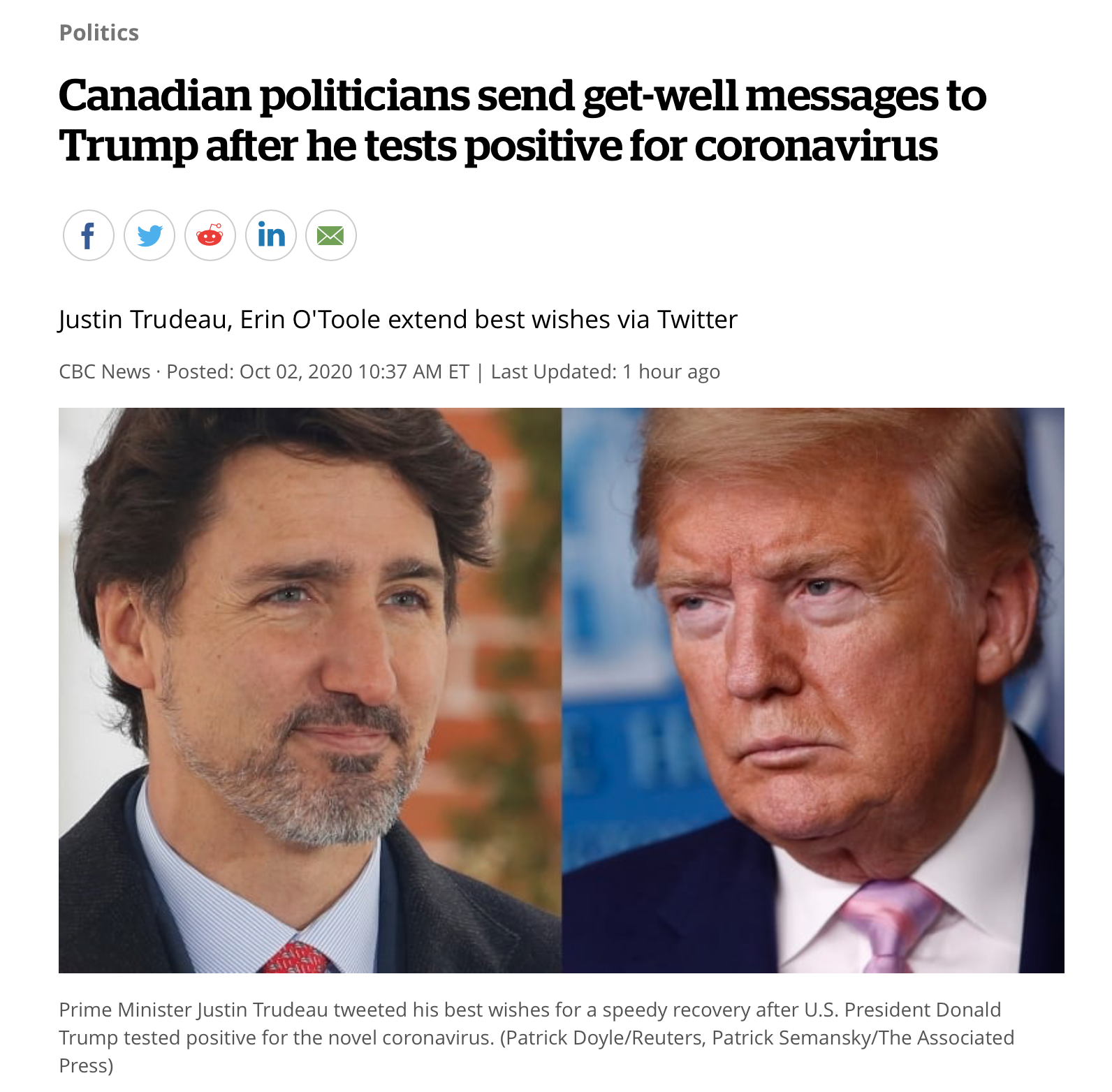 Justin Trudeau and other prominent Canadian politicians, such as Conservative leader Erin O'Toole. have sent get-well messages to Donald and Melania Trump due to their recent positive COVID-19 test.