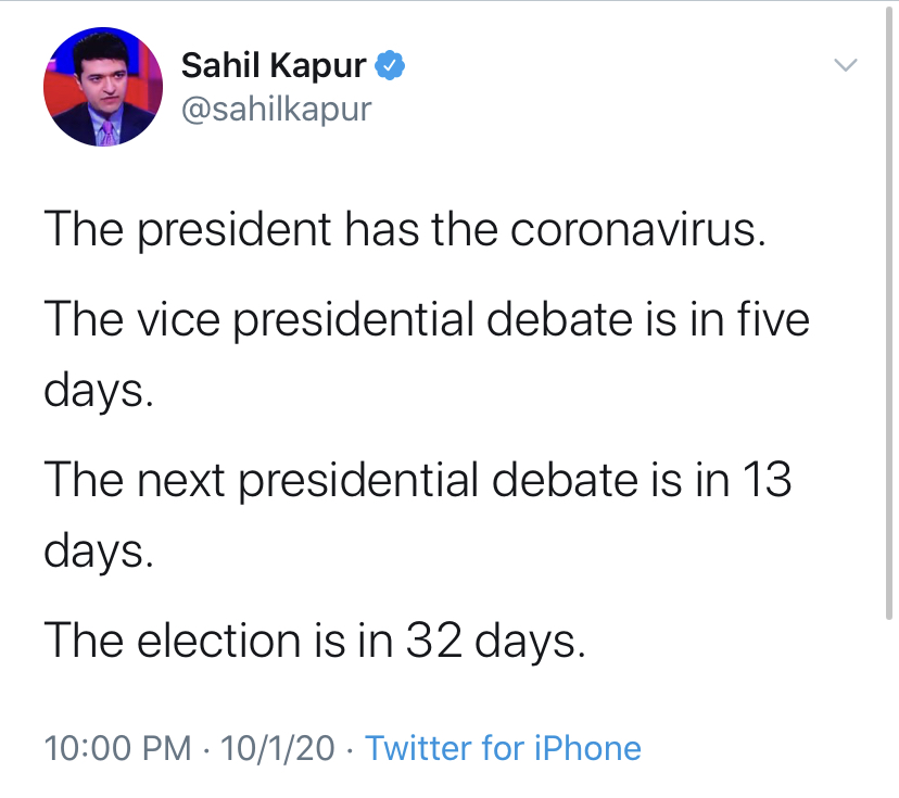 @sahilkapur on twitter updates the public on the current status of the presidential debate after President Donald Trump is confirmed to have coronavirus