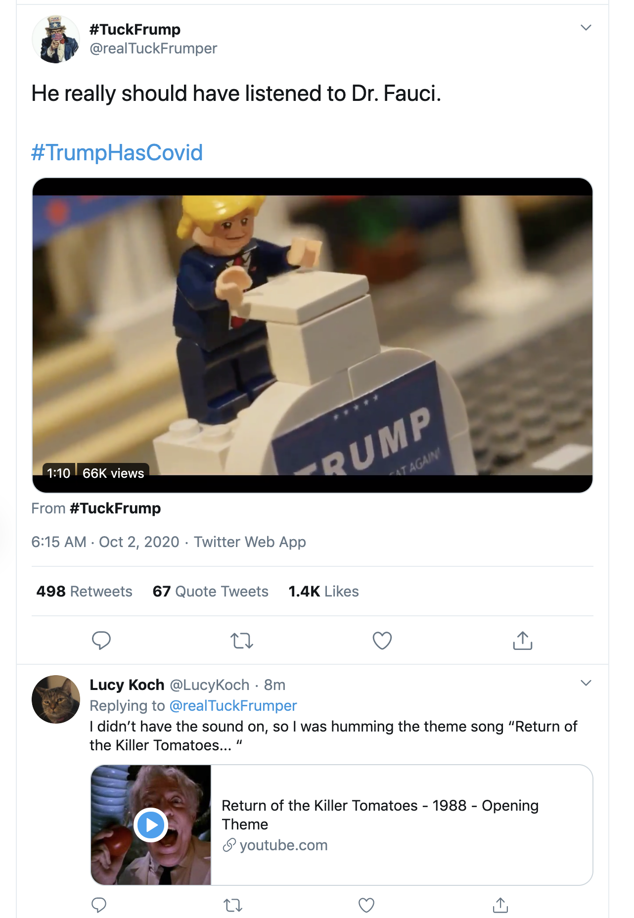 Last night around midnight, we learned that Trump tested postive for COVID. And I recognize it's not the most mature move, but this morning I woke up and started looking for Trump memes or memes about Trump. On Twitter I found the hashtag #TrumpHasCovid and found this video. It shows a lego representation of President Trump at a podium, and the audio plays several of his statements about COVID-19 and the pandemic. In the end, Trump gets run over by coronavirus (represented as a tomato) and it eats him, but spits out the tupet. Later, a street cleaner gets the tupet caught in his vechincle and it blows up.