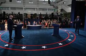 A presidential debate unlike any other (for many reasons). In a regular presidential debate there are usually more people packed together in the room. Attendees can be seen in distanced seating and most are wearing masks.