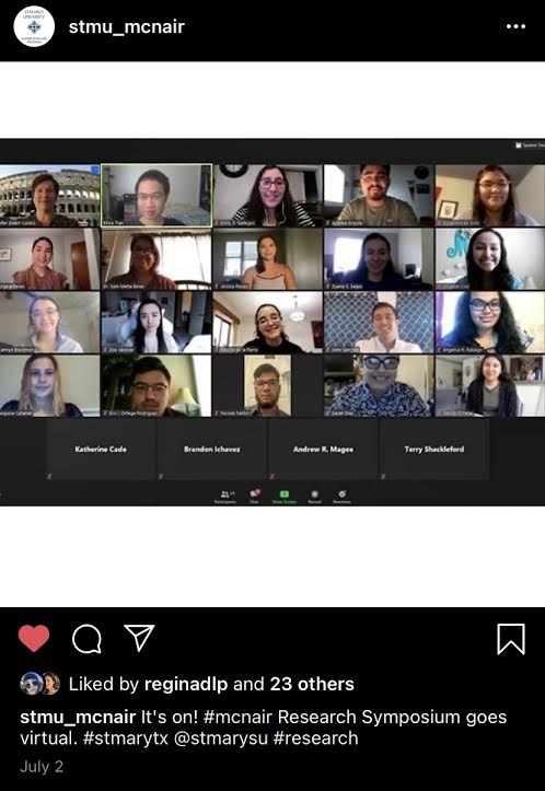 The post is a screenshot from the annual McNair Scholars Program Research Symposium from the summer. The screenshot captures students and faculty from the program before they began their presentations over zoom. The McNair Scholars program prepares underrepresented students for graduate school. Students have a faculty mentor who advises them on a research project during the summer, where they write a paper, prepare for graduate school applications, and then later present the research at the annual research symposium. Usually, the program takes place on the St. Mary’s University campus, and students are provided campus resources such as housing and meal plans. They can meet with faculty and peers in person. Due to COVID-19, the program had to be completely virtual; every program meeting utilized zoom. The McNair Scholars summer research program is one example of college activities that had to adapt to the changing world with COVID-19. Although students were still able to meet virtually and present research, there were limitations to not being on campus, such as what research you could conduct and the resources and accessibility of having workspaces on campuses as many students were working at home. The picture also represents the new normal of large gatherings, especially for academic spaces. All of our classes resemble this image now.