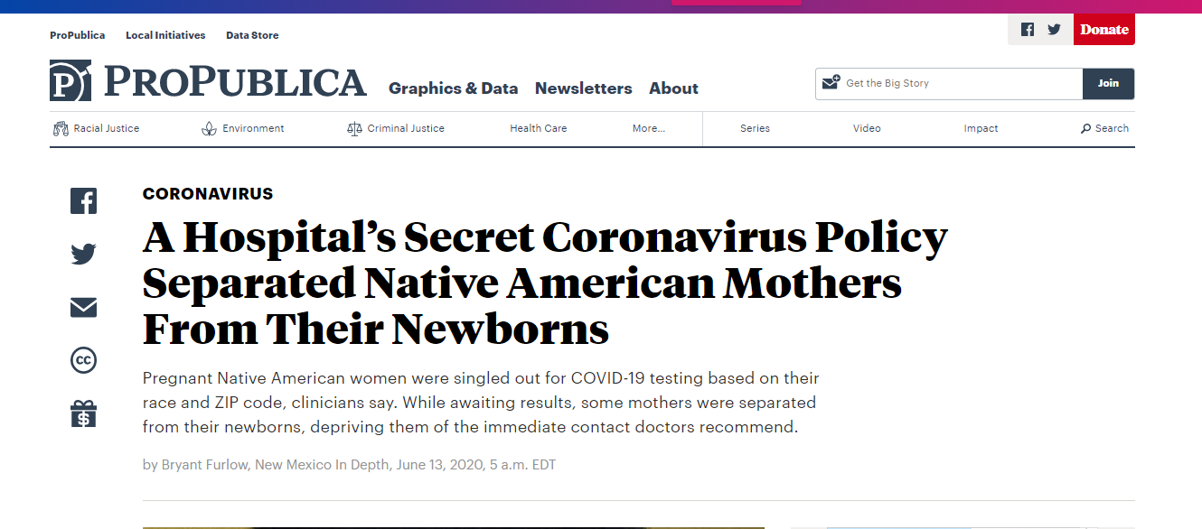 Lovelace Women’s Hospital in Albuquerque, New Mexico implemented a secretive policy that racially profiled Native American mothers. As expecting mothers who “looked” Native were admitted into the hospital, staff would compare their area codes to a list of zip codes belonging to Native lands such as Reservations or Pueblos. After being identified as “a person under investigation for COVID-19”, mothers were often misled or were forced into signing a wavier that gave permission for hospital staff to remove the newborns from their parents after birth. The families were only reunited once the pending coronavirus test results came back negative. Test results took up to three days to come in, thus leaving the mothers in fear and uncertainty about the wellbeing of their child.