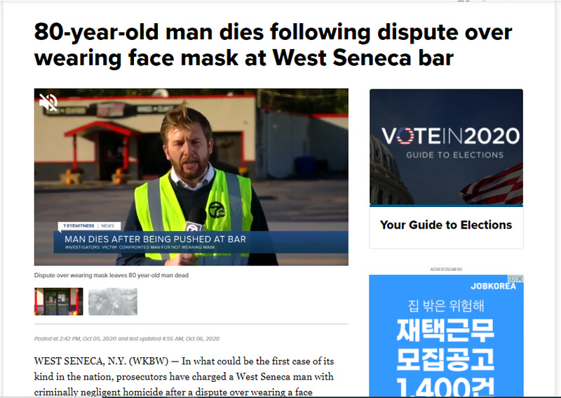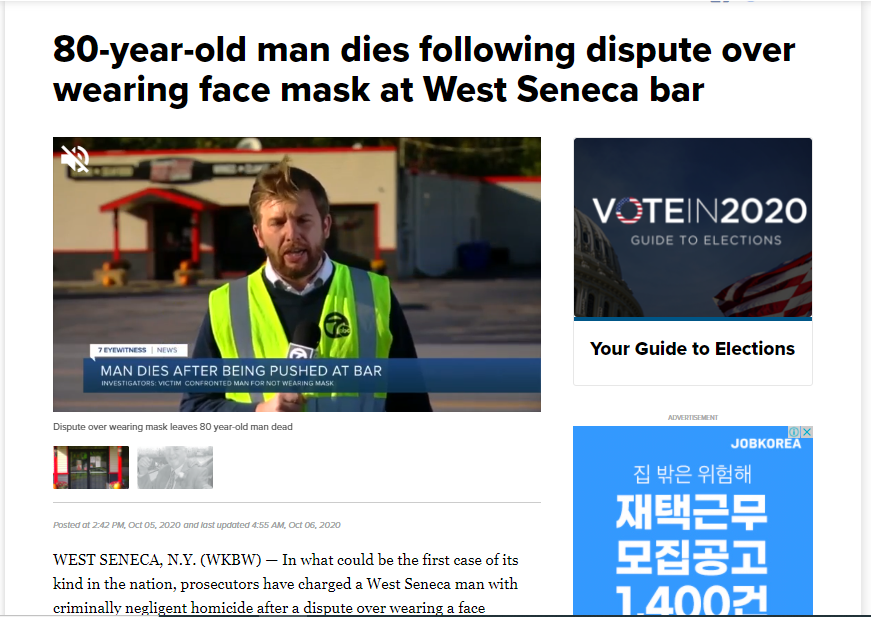 This incident happened in a neighborhood near my own. An elderly man was concerned when he saw a patron in the same bar as him without a mask. In New York State, masks are required inside all buildings open to the public by Governor Andrew Cuomo's order. The elderly man, Rocco Sapienza, confronted the anti-masker, Donald Lewinski, asking him why he wasn't wearing a mask and suggesting he put one on. Lewinski shoved Sapienza to the ground where he hit his head and never regained consciousness. Sapienza subsequently died in the hospital. Lewinski has been arrested.
