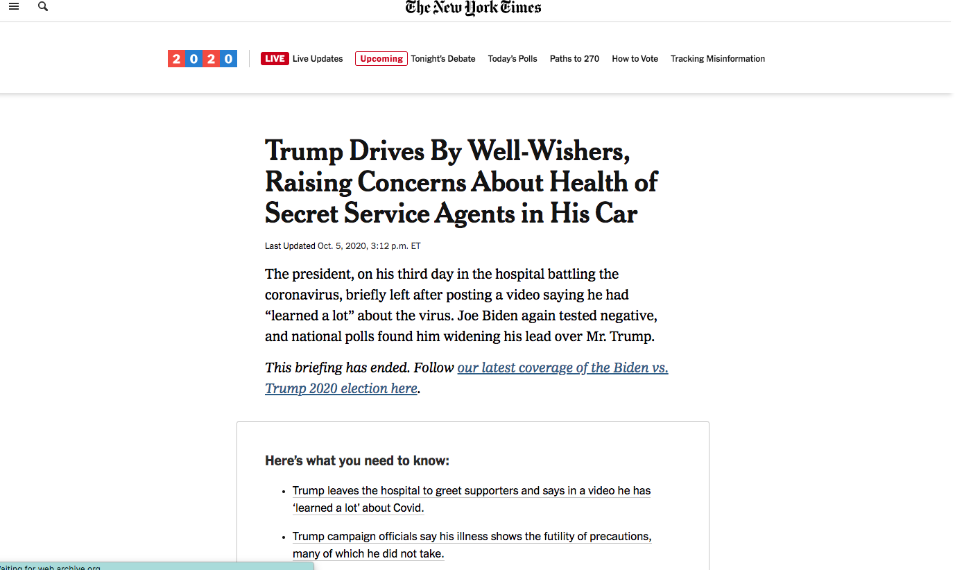 The bias that exists in this article puts a negative spin on Trump. For example, the article stated that “The president[‘s] mishandling of the pandemic has become a political liability”, making it clear that the writers of the article don’t believe that Trump has done a good job protecting citizens from the pandemic and that it’s hurting his political side. The article also included a statement made by a doctor at the hospital Trump stayed at. The quotes that the article included from the doctor were that Trump was putting the lives of the Secret Service agents in the car with him at risk. The doctor also stated that “the irresponsibility [was] astounding”, that the agents were “commanded by Trump to put their lives at risk for political theater”, and that it was “insanity”. By choosing to include these many quotes from the doctor, New York Times is siding with the doctor, implicitly agreeing that what Trump did was irresponsible. The article also stated that the N95 masks that the agents were wearing were “not an absolute guarantee of stopping transmission, especially in a small enclosed space occupied by a person known to be infected”; even though this statement doesn’t explicitly state it, the authors of this article don’t believe that the agents were protected well enough and that it wasn’t a smart choice. The article seems to contain Liberal views and biases.