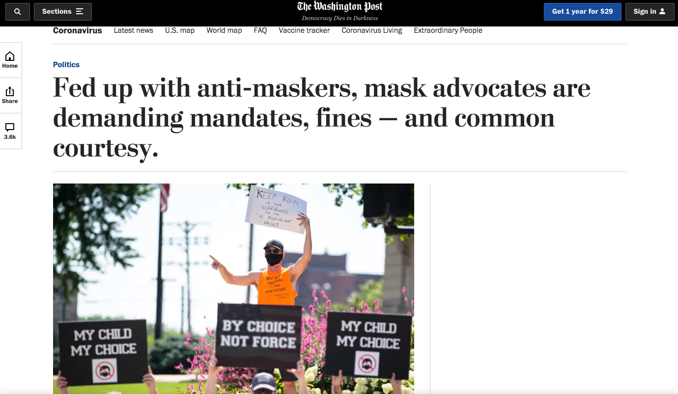 The article is overall pretty neutral, it isn’t attacking any of the sides. However, most of the situations that it gives show the bad sides of anti-maskers, for example, an anti-masker assaulting a worker who asked them to wear a mask. It also took quotes and opinions from a former Trump supporter and other mask advocates.