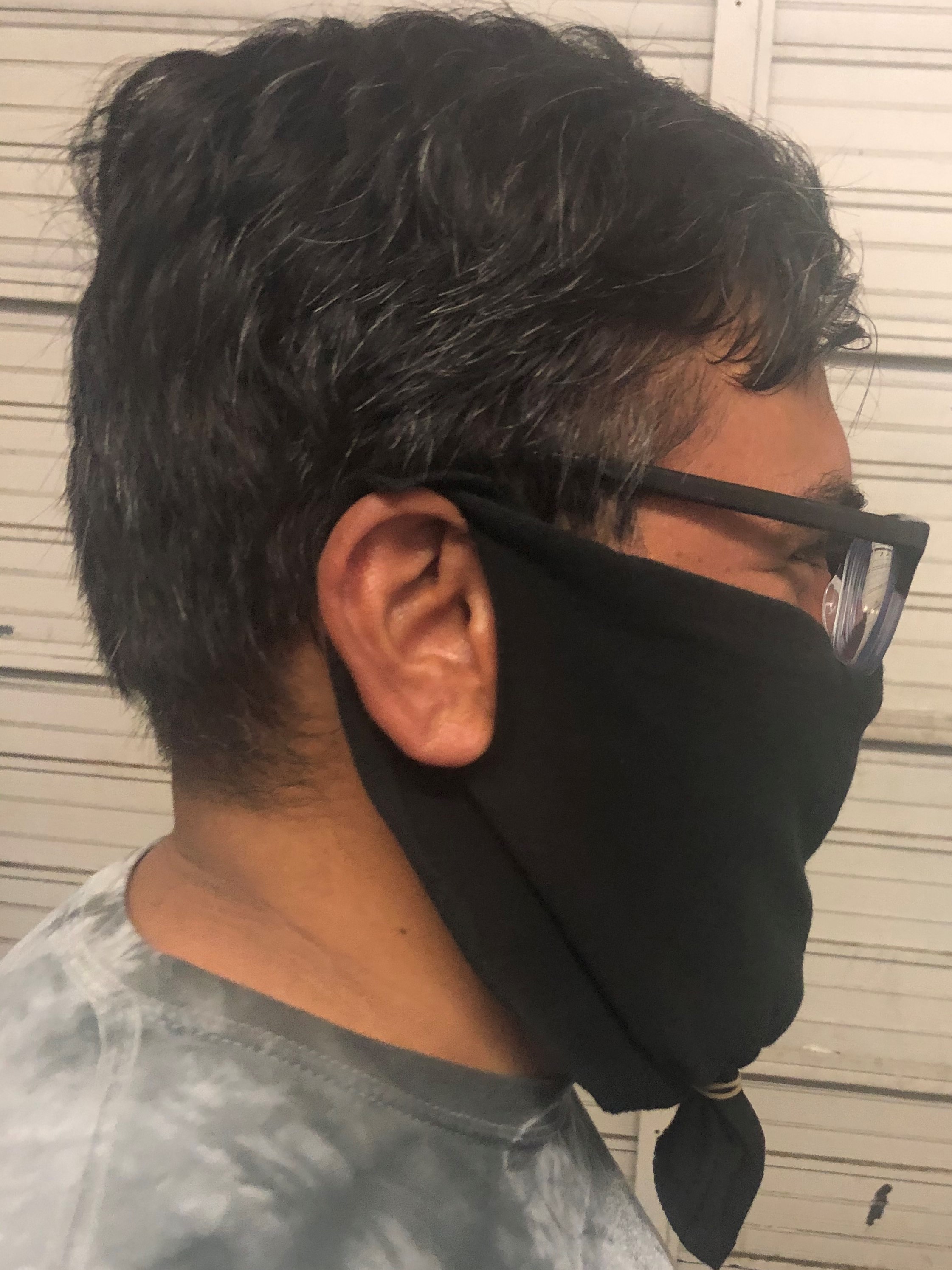 The photos show my friend Jacob who tried out a variety of masks to suit his personality. He is very crafty and likes to customize everything he possibly can. Unsatisfied with the poor quality of disposable masks, he made a very unattractive mask out of an old t-shirt. Although he liked the way the mask hugged his ear, the thickness of the fabric made it difficult for him to breathe. Jacob eventually sewed his own mask much to his wife’s chagrin. He was pleased that it provided enough coverage over 60% of his face, and that he figured out a way to make the straps adjustable.