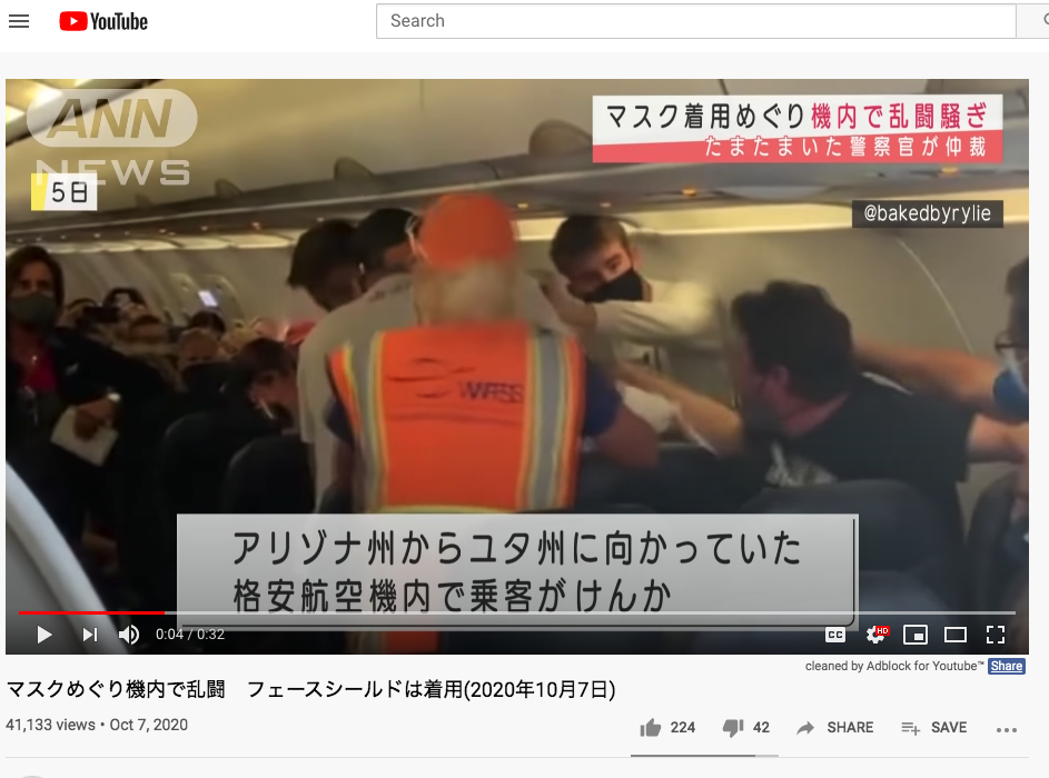 マスクめぐり機内で乱闘 フェースシールドは着用(2020年10月7日) - Brawl on the plane about the mask Wearing the face shield (October 7, 2020)