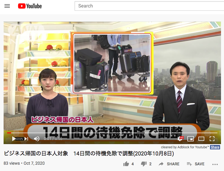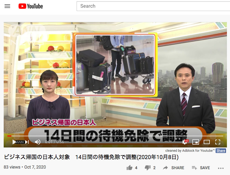 ビジネス帰国の日本人対象 14日間の待機免除で調整(2020年10月8日) – Adjustment of 14-day quarantine period for Japanese returning to business (October 8, 2020)