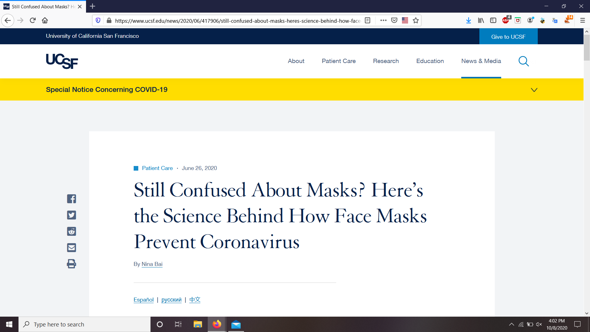 In this article, there is no bias standing out to me. This article is a fact based article that provides scientifically proven information about the virus. All of the claims of this article has stated have been run by tests. For example, a test was run about how many respiratory droplets left one’s mouth when saying a simple phrase. Without a mask, there was a range from 20-500 micrometers generated. With a face mask, nearly all of the droplets were trapped by the face mask.