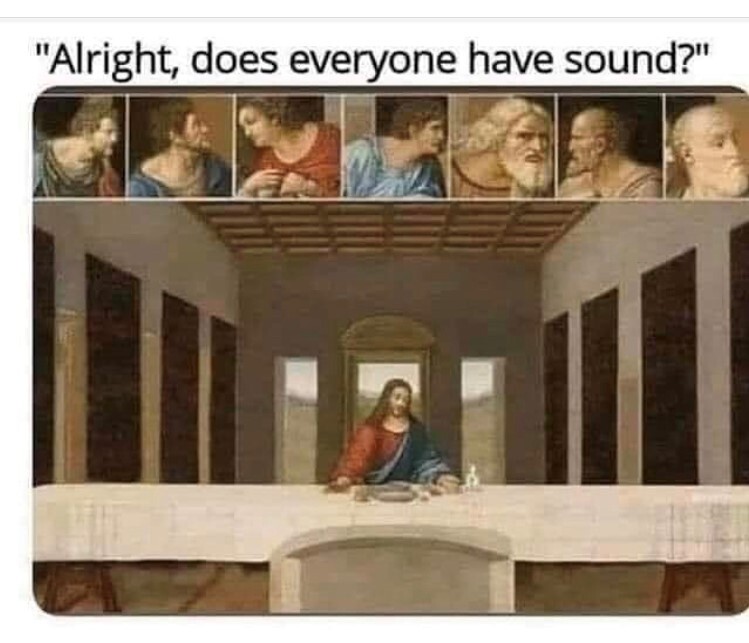 Meme of Jesus on a Zoom call with the disciples at the Last Supper.