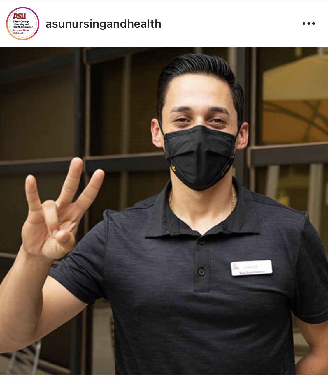 This picture is of me taken after an EOSS Social Roundup interview about my experience with school, work, and life during the COVID- 19 pandemic. This picture was also uploaded to the Arizona State University Edson College of Nursing and Health Innovation Instagram page (asunursingandhealth) and scholarship page. This interview will be incorporated to a video that will be shown to incoming first year students. The goal of this project was to clarify any questions that any future students may have and provide comfort to them through the firsthand experiences of multiple students at Arizona State University. Students were taken to various parts of the Downtown Phoenix Arizona State University campus and were asked questions pertaining to their involvement in campus, class, and how they incorporated safety measures while attending on campus. Personally, I was able to give detailed responses about how professors handled in- person classes and what measures they took to keep their physical students safe. I was also able to share my work experience at the university during this pandemic. I work at the university residential hall and Sun Devil Fitness and Wellness Complex. I was able to give a detailed description of how we, at my student jobs, have taken various measures to keep a safe and sanitary environment to keep our residents and patrons safe through this pandemic. My interview was also able to give an insight of living on campus during this academic year. I was able to answer questions about precautions that has been taken by university housing to keep their residents safe from this virus and reduce the potential spread. Overall, I hope that my insight given in this interview will put future incoming students at ease or encourage them to come to campus. All of this is to show the students that we are taking various safety measures to keep them at low risk and show them that they are in our best interest.