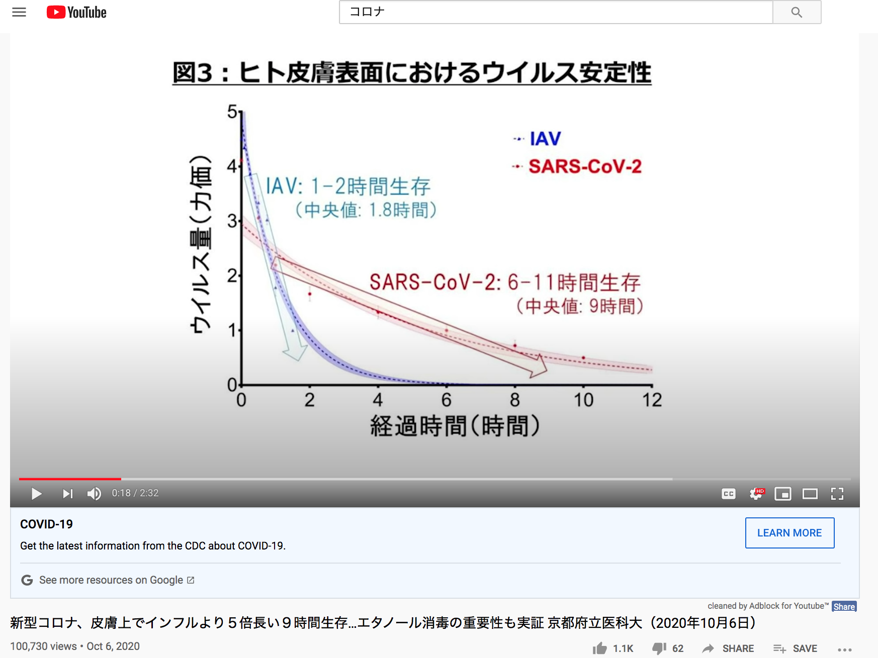 新型コロナ、皮膚上でインフルより5倍長い9時間生存…エタノール消毒の重要性も実証 京都府立医科大(2020年10月6日)- New corona survives 9 hours on the skin, 5 times longer than influenza … Demonstrates the importance of ethanol disinfection Kyoto Prefectural University of Medicine (October 6, 2020)