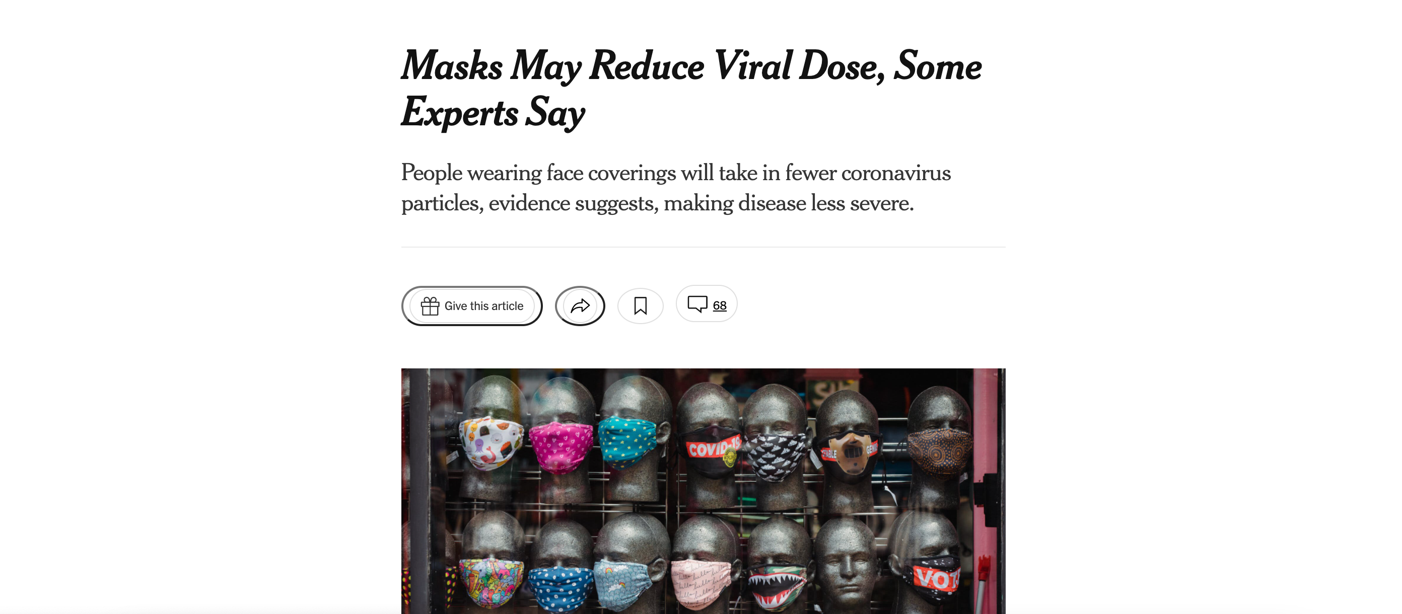Many Researchers have known that masks can prevent people from spreading viruses to others. Dr. Monica Gandhi, an infectious disease physician made the argument that people wearing face coverings will take in fewer coronavirus particles. They have found the more virus in the nasal plume, the likelier the people were to get infected and experience symptoms. Some researchers have estimated that about 40 percent of coronavirus infections do not produce any symptoms. But when people wear masks, the proportion of asymptomatic cases seems to increase. Wearing a face covering doesn’t make people impervious to infection, but these trends could make a milder disease, reducing deaths.