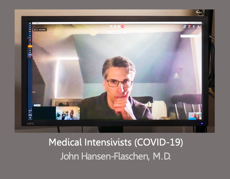 This is a photojournalism project featuring videoconference portraits. The subjects are critical care faculty physicians and fellows engaged in emergency preparedness huddles and coordination of care meetings that took place during April and May of 2020 as the staff of downtown Philadelphia hospitals of the University of Pennsylvania Health System scrambled to accommodate an unprecedented onslaught of patients with acute respiratory failure caused by Covid-19 infection.