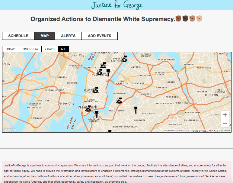 As a librarian who works alot with maps, I am very impressed with this site: Justice for George Floyd. This is a way for anyone who wants to protest in the greater NYC area to keep track of upcoming and past events. You can also sign up and add your own events, which will then appear with a description link and an appropriate protesting icon on the map.