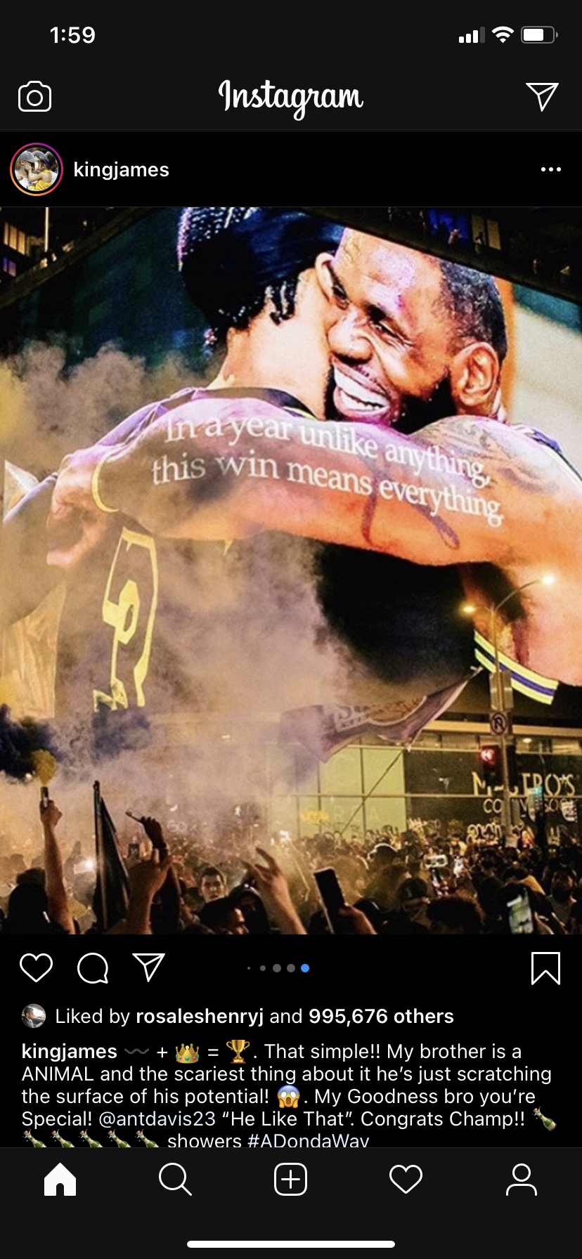 The Los Angeles Lakers had not been to a final in ten years. Our city was full of hope and excitement when this years team was assembled (along with a new head coach). Then 2020 started and our world seemed to fall apart. For the team and our city specifically the loss of Kobe Bryant, his daughter Gigi and all those on that plane, that foggy morning in February was almost too much to bare. The truth is that this year has seen the loss of so many positive people in our society, that partnered with the global pandemic and the terrible leadership in the White House has dubbed this year the unofficial official worse year ever. Of course I think the title is a bit dramatic and things can always be worse but I think we can all agree that this year has been pretty terrible, politically, socially, economically and morally. The lakers won last night, I was watching with my city and for the first time in a long time felt the need to celebrate. It’s the end of the year, and I can’t help but hope that this cause for celebration will be a turning point.
