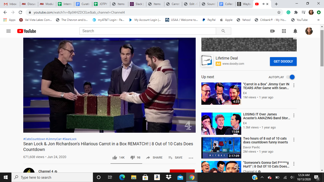During Lockdown in the search for routine and some sort of normality, usually my weekdays finish with ABC News at 7pm followed by 8 out of 10 Cats does Countdown at 7:30. Being a news snob I have always watched ABC, but recently 8 out of 10 Cats has become a new daily routine that provides regular humour relief from a bleak day inside. Hosted by Jimmy Carr and filled with stupidity as well as 'play-at-home' Countdown gameshow rounds, I have really fallen in love with it. The show is reliable, positive and immature, three things that are hard to come by at the moment. Further to that a pipe dream of mine is to one day live in the UK, and with borders closing until the end of 2021 that feels like a very long pipe, but getting to watch it even now makes me feel like maybe I'll watch it with a cup of tea in London somewhere. This particular clip was one of the funnier things I've ever seen on TV, let alone on this show, and made a mediocre night watching TV a conversational piece about a carrot in a box.