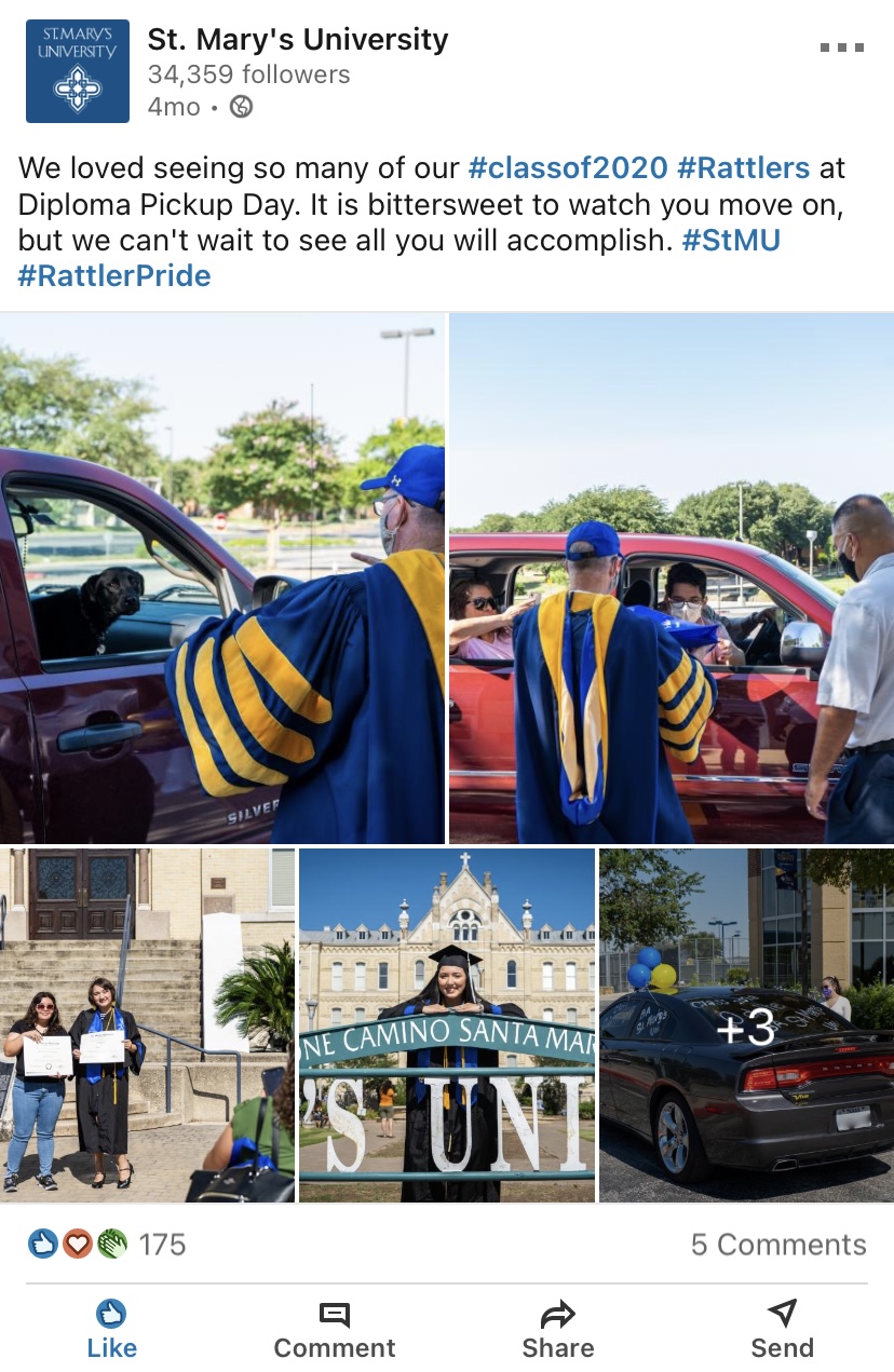 The object is a post from St.Mary's University Linkedin account. The account posted pictures of seniors picking up their diplomas from campus.