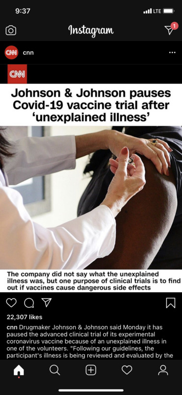 CNN reports that Johnson and Johnson put their vaccine trials on pause after one of their volunteers is experiencing an unexplained illness. As if many people weren’t already sketched out about this vaccine race this is yet another reason why many are saying they’ll wait a while to get vaccinated. I for one, will wait until it’s ok’d by the CDC and the first wave of people vaccinated don’t have adverse reactions.