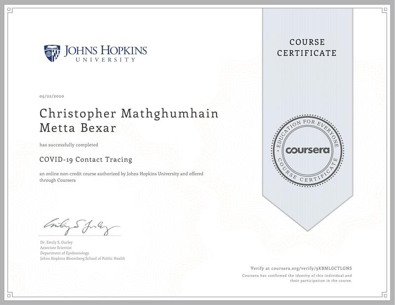 This is a jpg file of a certificate I earned from a well-respected university on the topic of Covid-19 protection. Was sent to me for completing a course on Covid contact tracing,