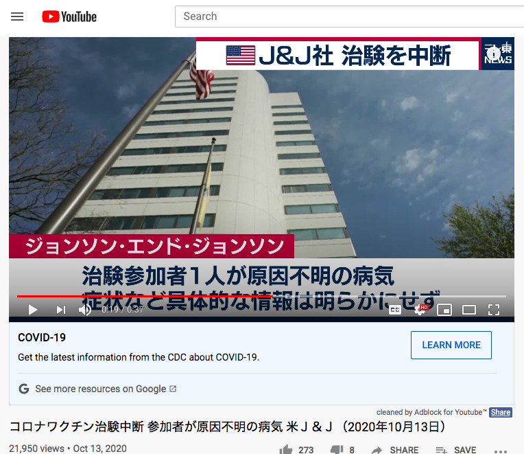 コロナワクチン治験中断 参加者が原因不明の病気 米J&J(2020年10月13日)- Corona vaccine clinical trial suspended. Illness of unknown cause by participants. US J & J (October 13, 2020)