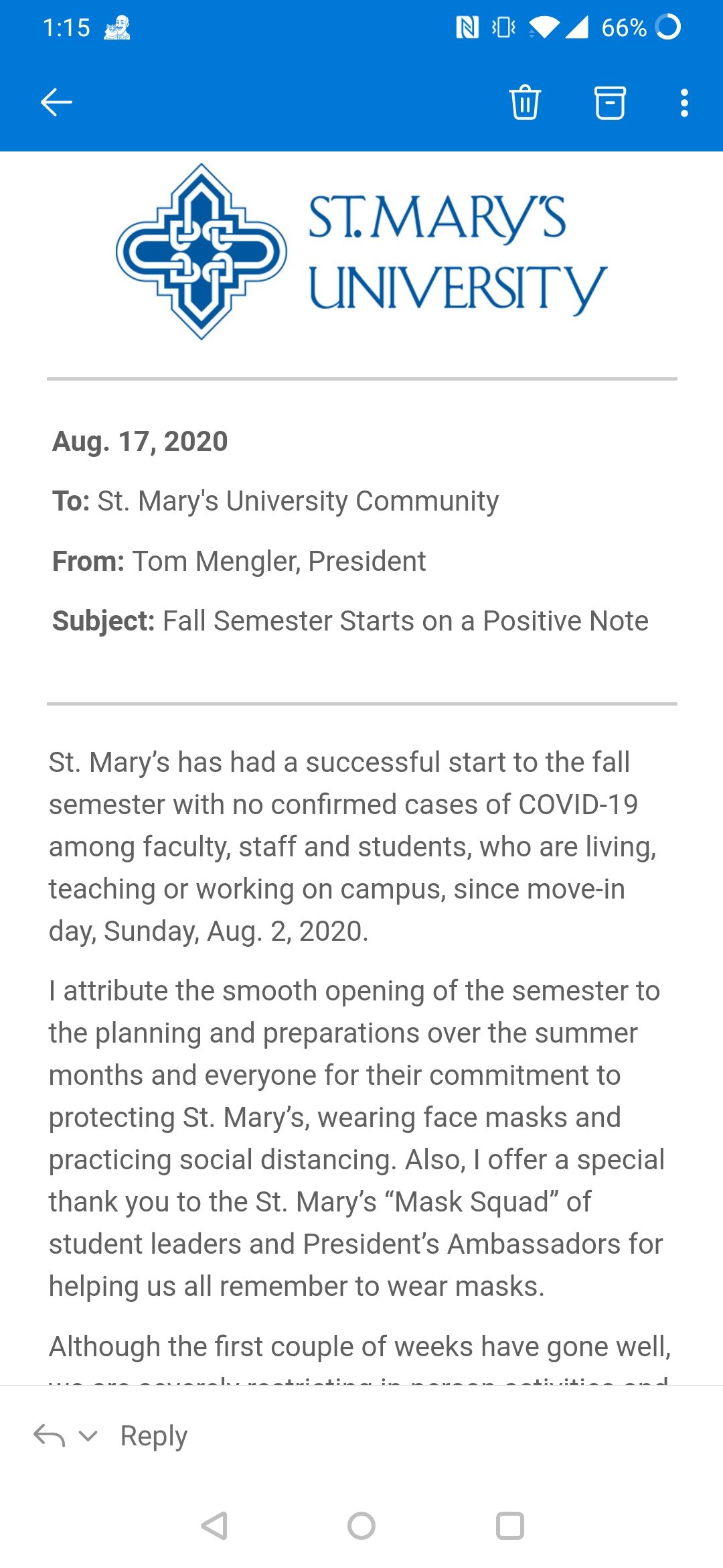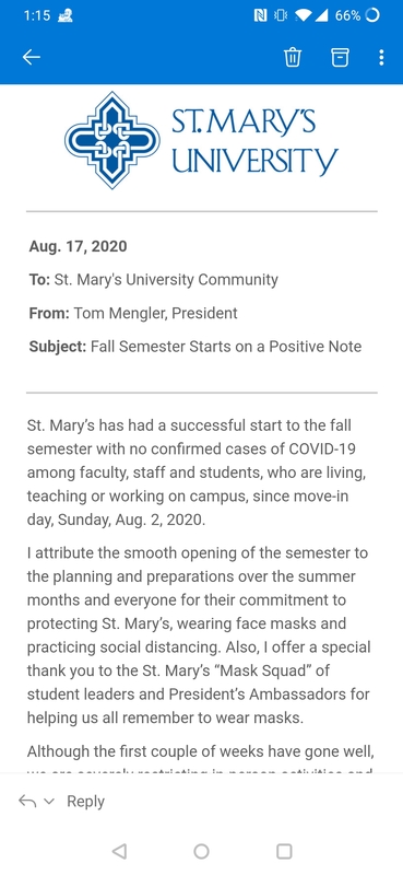 This email was one of the first ones I received from the university when I first began graduate school. It was sent by the university's President, Tom Mengler. It details the lengths the university is going to in order to protect their students, faculty and other workers. For the first few weeks of the semester there were no reported cases of COVID-19 amongst people at the school. Compared to how other universities are handling the pandemic this shows that St. Mary’s actually cares about it’s students. It made me feel a little safer knowing that the university administration is taking steps to ensure that it’s people are protected.