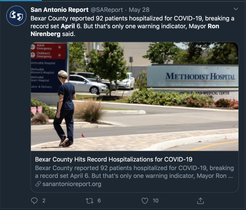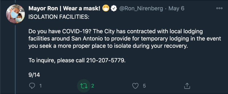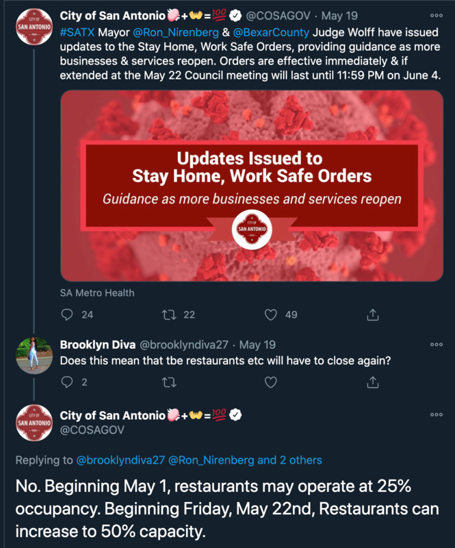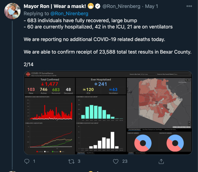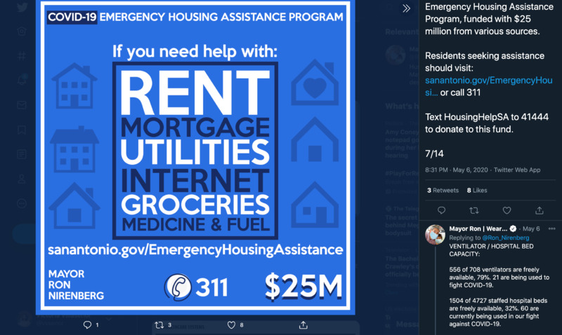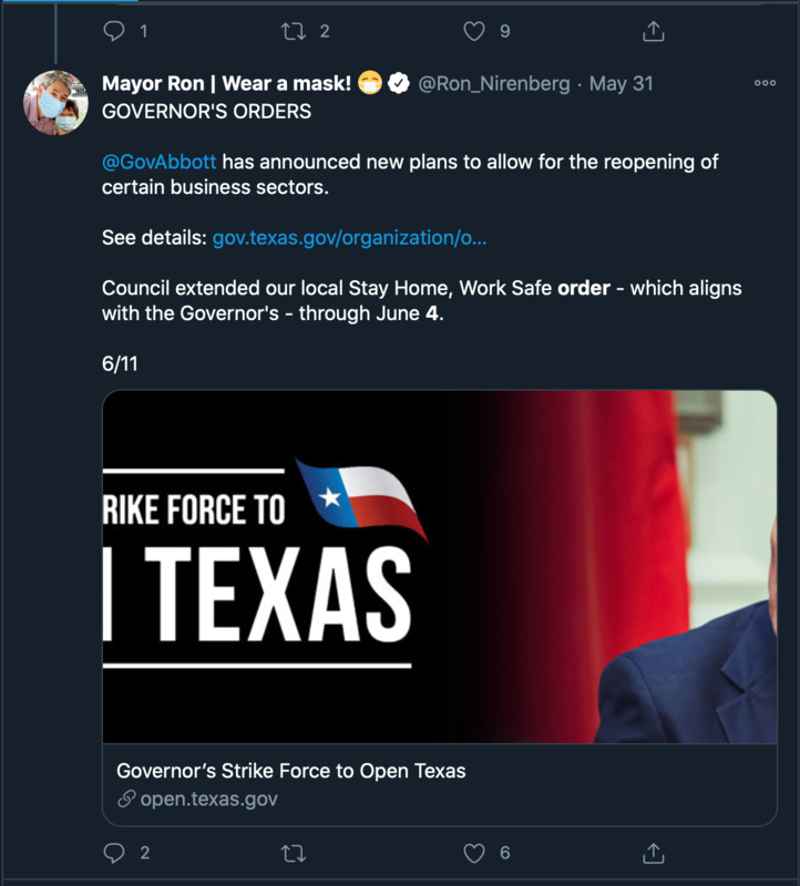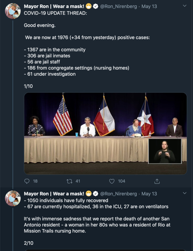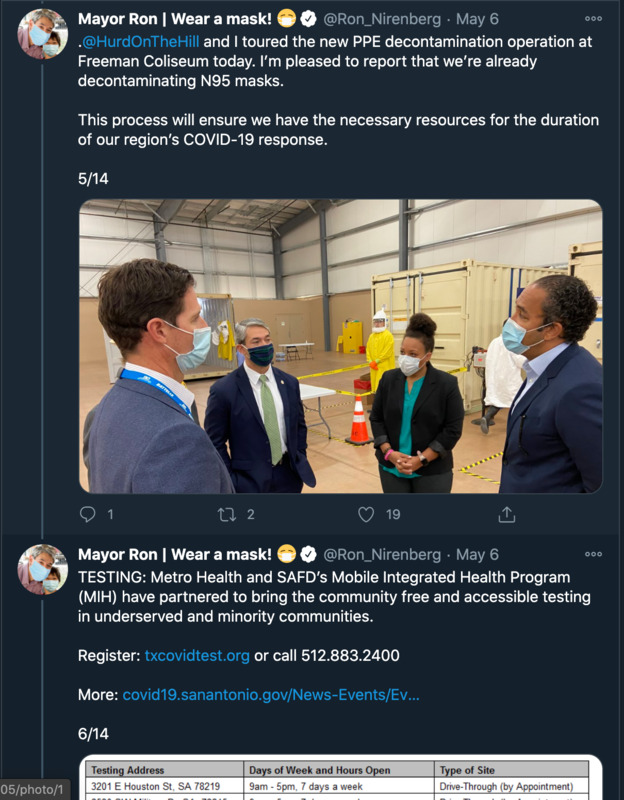 These series of images are tweets from or about San Antonio mayor Ron Nirenberg and his administration's response to the COVID-19 crisis throughout the month of May. These images illustrate the way local government mobilized to disperse political, economic, and medical information through social media.