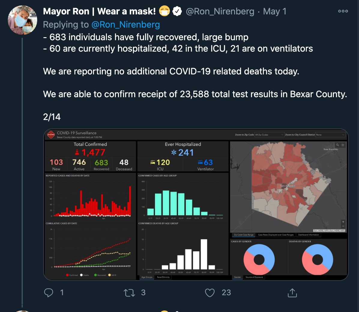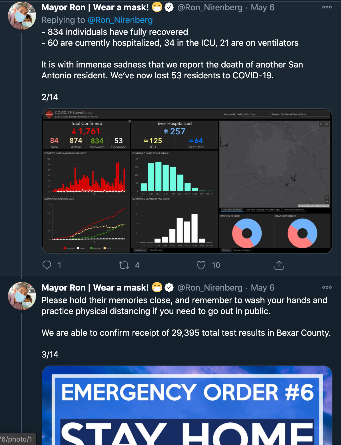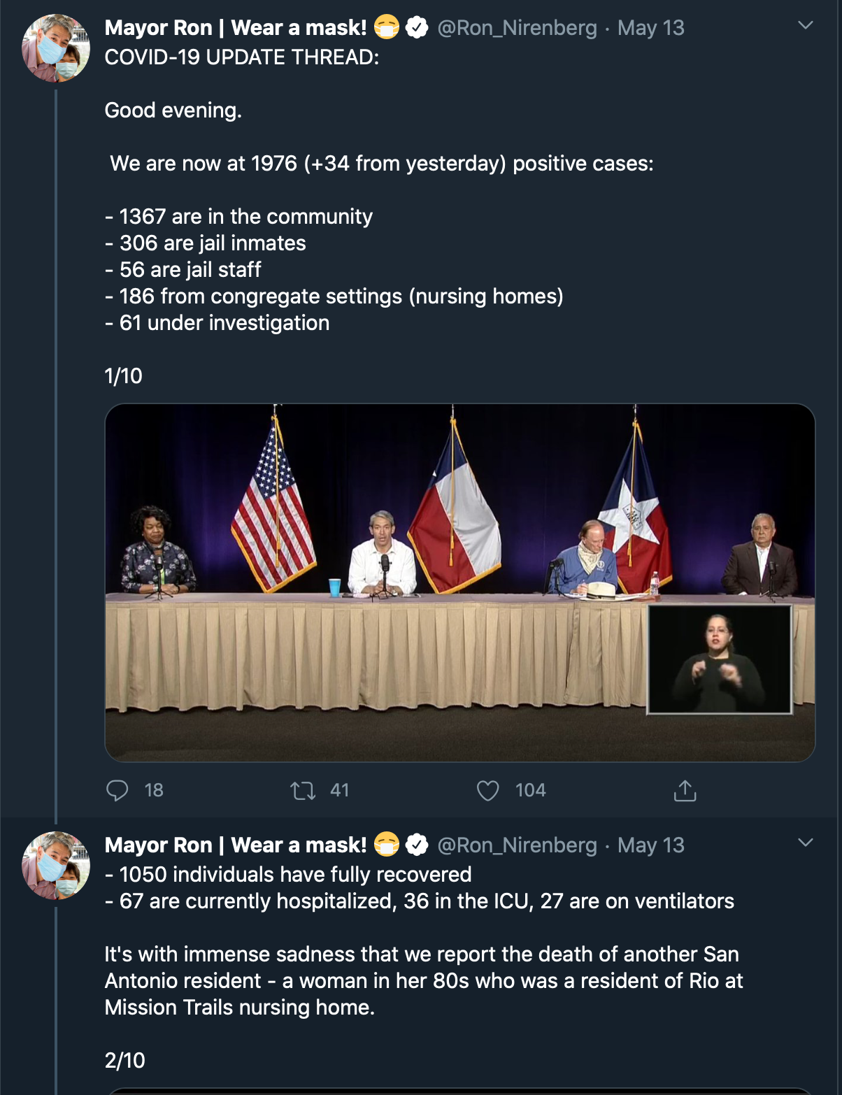 Tweets from San Antono's mayor Ron Nirenberg throughout May, 2020