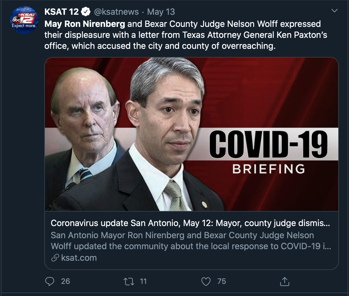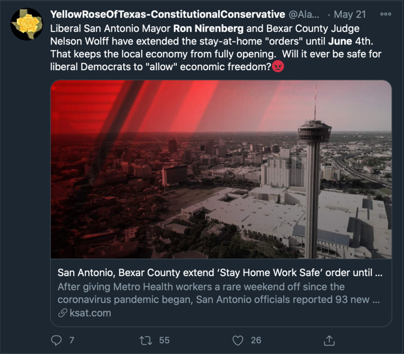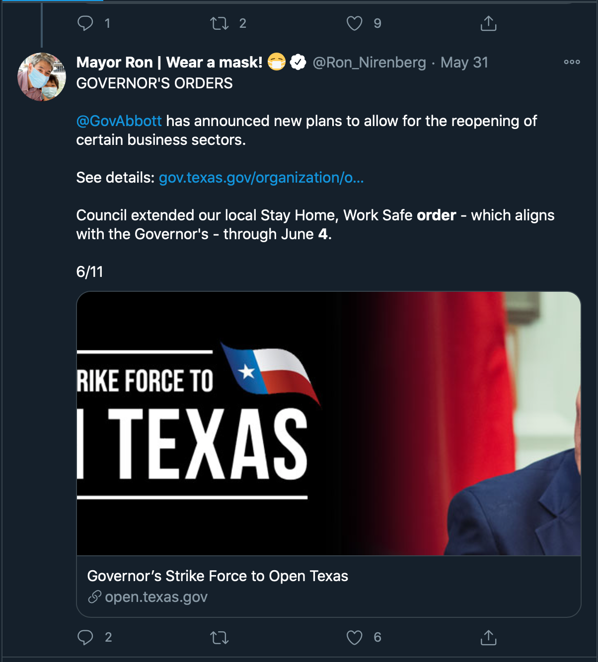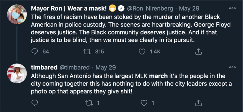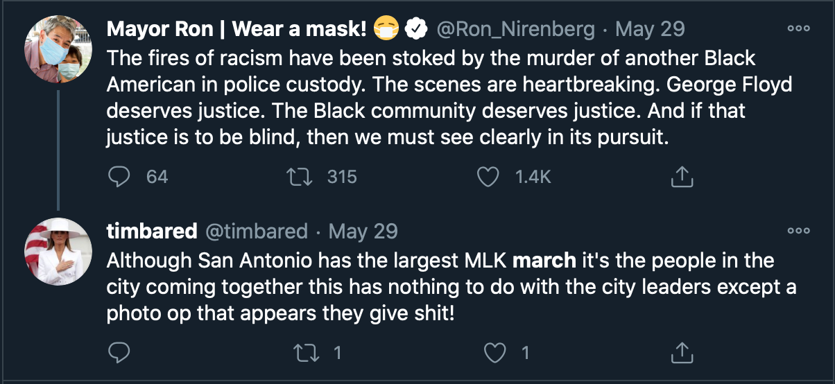 Tweets from San Antono's mayor Ron Nirenberg throughout May, 2020