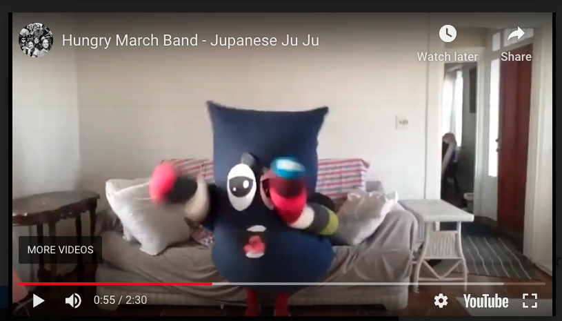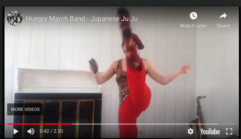 Since March 2020, the Hungry March Band, for which I have played tenor sax for about 20 years, has been on pause. We have not met, rehearsed, or done a gig this whole time. The only thing we have done is to create a few Covid-19 videos, in which everyone gets to have a different panel, since we can't all be together-then the editors mash everything together. This one is to the music of one of our oldest songs, Jupinese-JuJu. What I particularly love about the video is that we included shots of long time fans, emeritus members, and their families. I put in a couple of screen shots of me and my spouse (he's the pillow man) and a link to the video on Youtube.