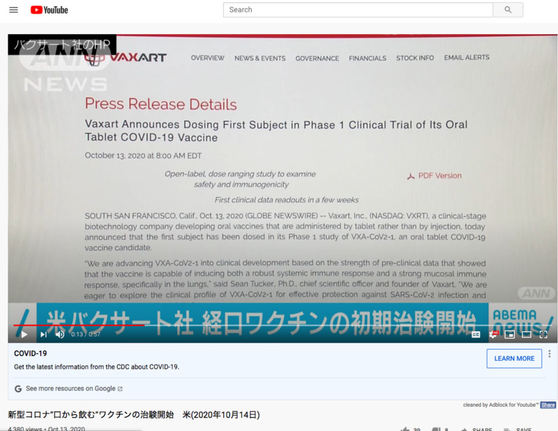 新型コロナ“口から飲む”ワクチンの治験開始 米(2020年10月14日) - Clinical trial for the new corona "drinking from the mouth" vaccine has started in the US (October 14, 2020)