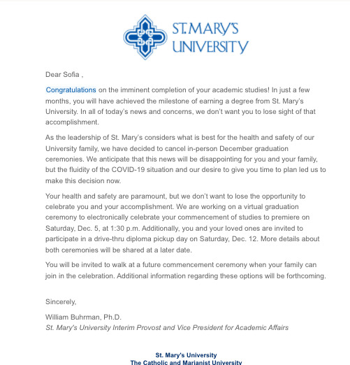 As a graduating senior, this email was sent to me by the Provost Office to notify me that this semester's graduation will be virtual. Ever since my freshman year of college, the idea of walking across the stage at my graduation always inspired me to try my best in all of my courses. My hard work and dedication was geared towards this big moment.