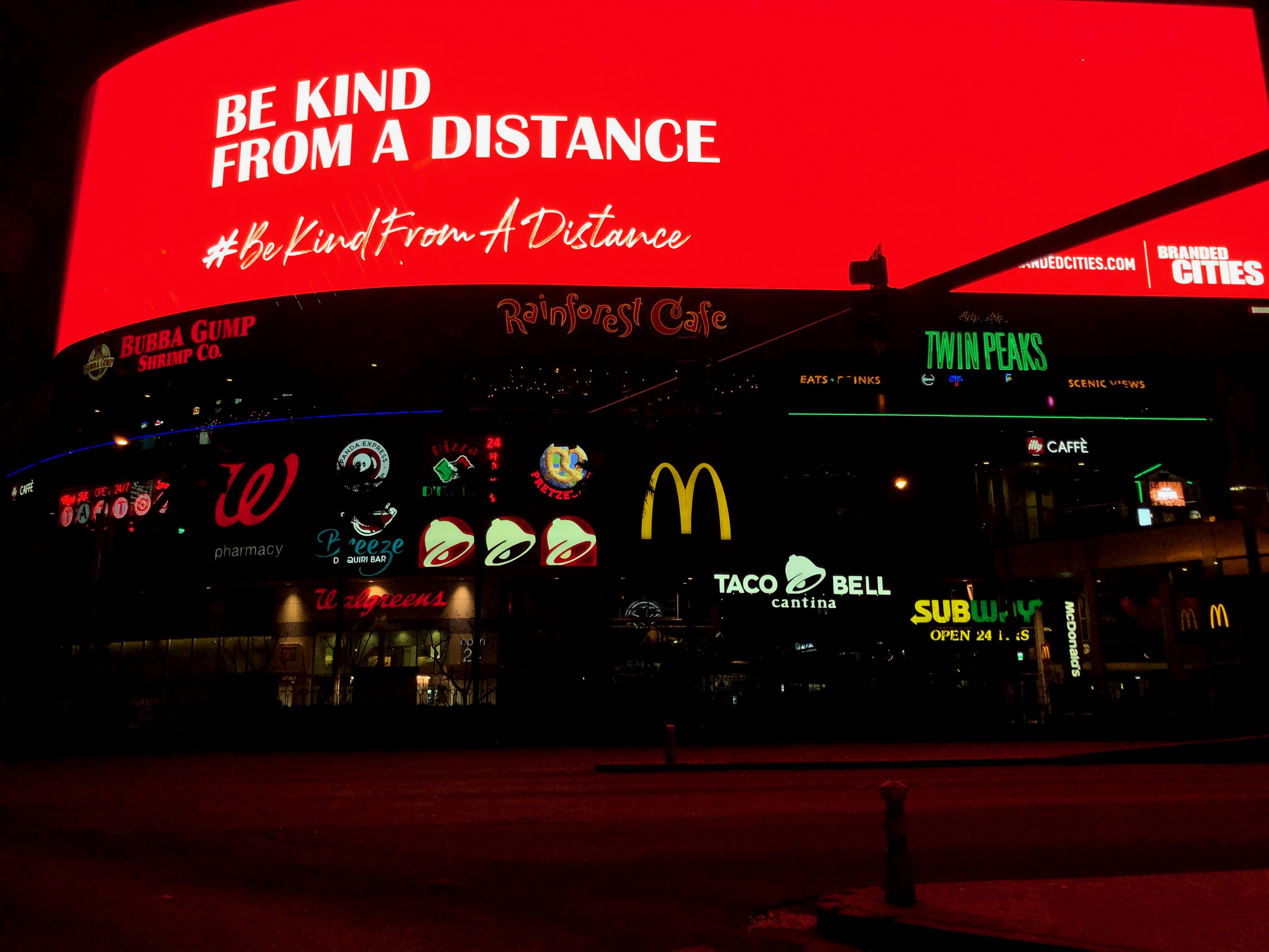 These two photos were taken on the strip at the beginning of lockdown in Las Vegas. Both photos show the government in action as they were taken during lockdown when the strip basically shut down. These photos show empty streets and billboards telling everyone to stay home and stay safe. The billboards provided a sort of unity within the city since it encouraged everyone to “be kind from a distance” and were small reminders that we were all in this together.