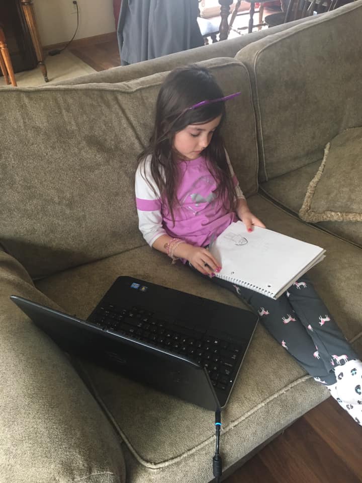 My six year old (shown here) and my ten year old began distance learning March 16, 2020. This photographs captures my kindergartner's first day of distance learning. She found it new and exciting but that feeling did not last long. This photograph is entitled "The Beginning of the Decline" as it was the last photograph I snapped of her before she would be diagnosed with anxiety.