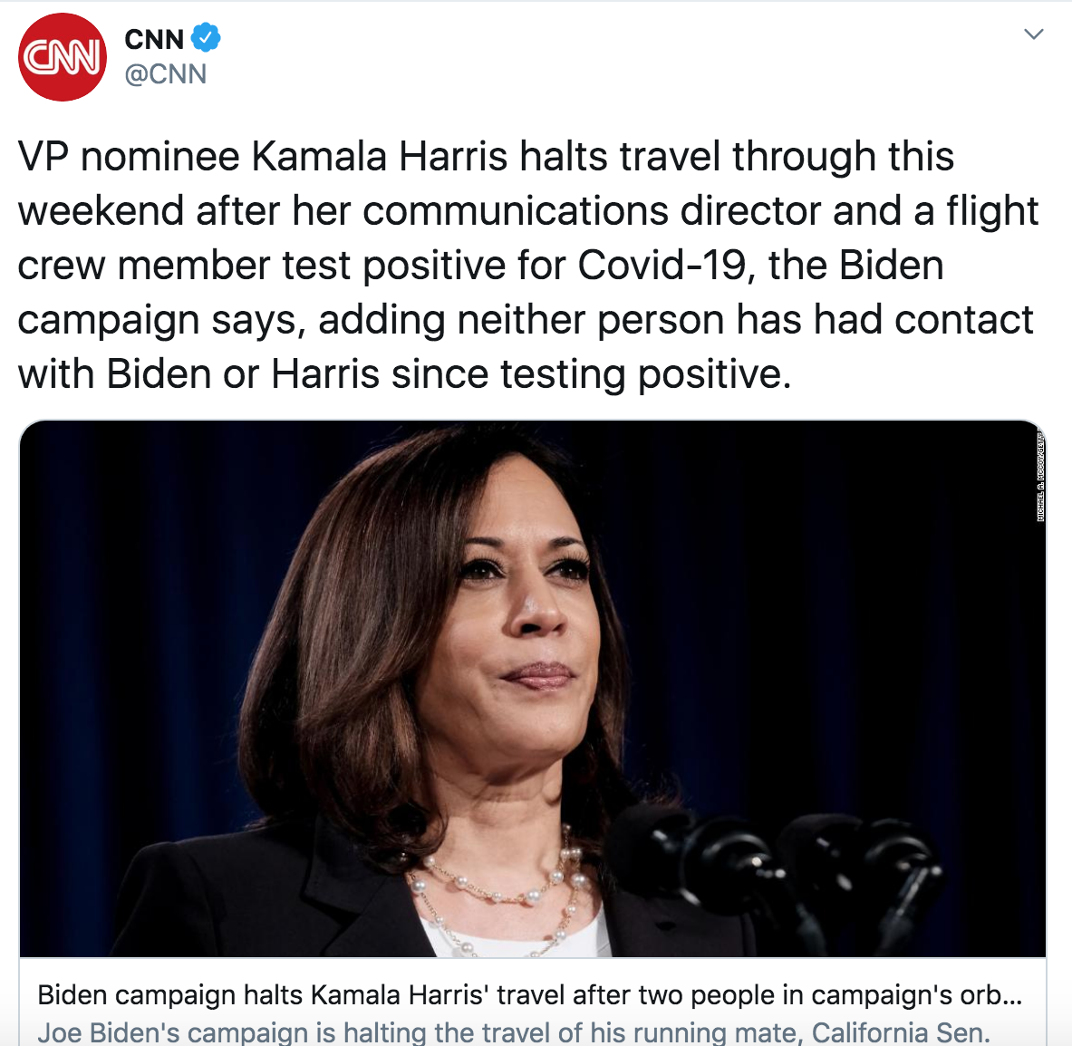 California Senator and Democratic Vice Presidential Nominee, Kamala Harris suspends her campaign travel following two positive cases in her campaign staff. This is a precautionary measure by the campaign. Neither Joe Biden nor Kamala Harris were exposed to either staffer.