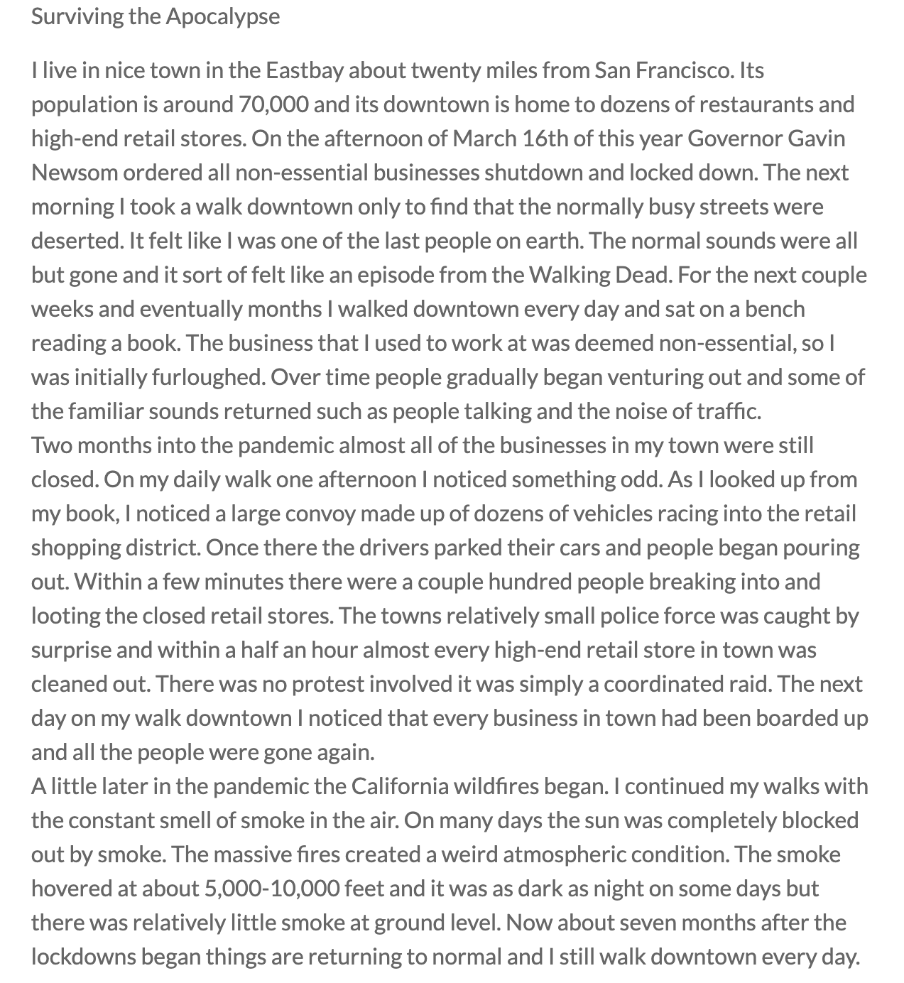 Two months into the pandemic almost all of the businesses in my town were still closed. On my daily walk one afternoon I noticed something odd. As I looked up from my book, I noticed a large convoy made up of dozens of vehicles racing into the retail shopping district. Once there the drivers parked their cars and people began pouring out. Within a few minutes there were a couple hundred people breaking into and looting the closed retail stores. The towns relatively small police force was caught by surprise and within a half an hour almost every high-end retail store in town was cleaned out. There was no protest involved it was simply a coordinated raid. The next day on my walk downtown I noticed that every business in town had been boarded up and all the people were gone again.