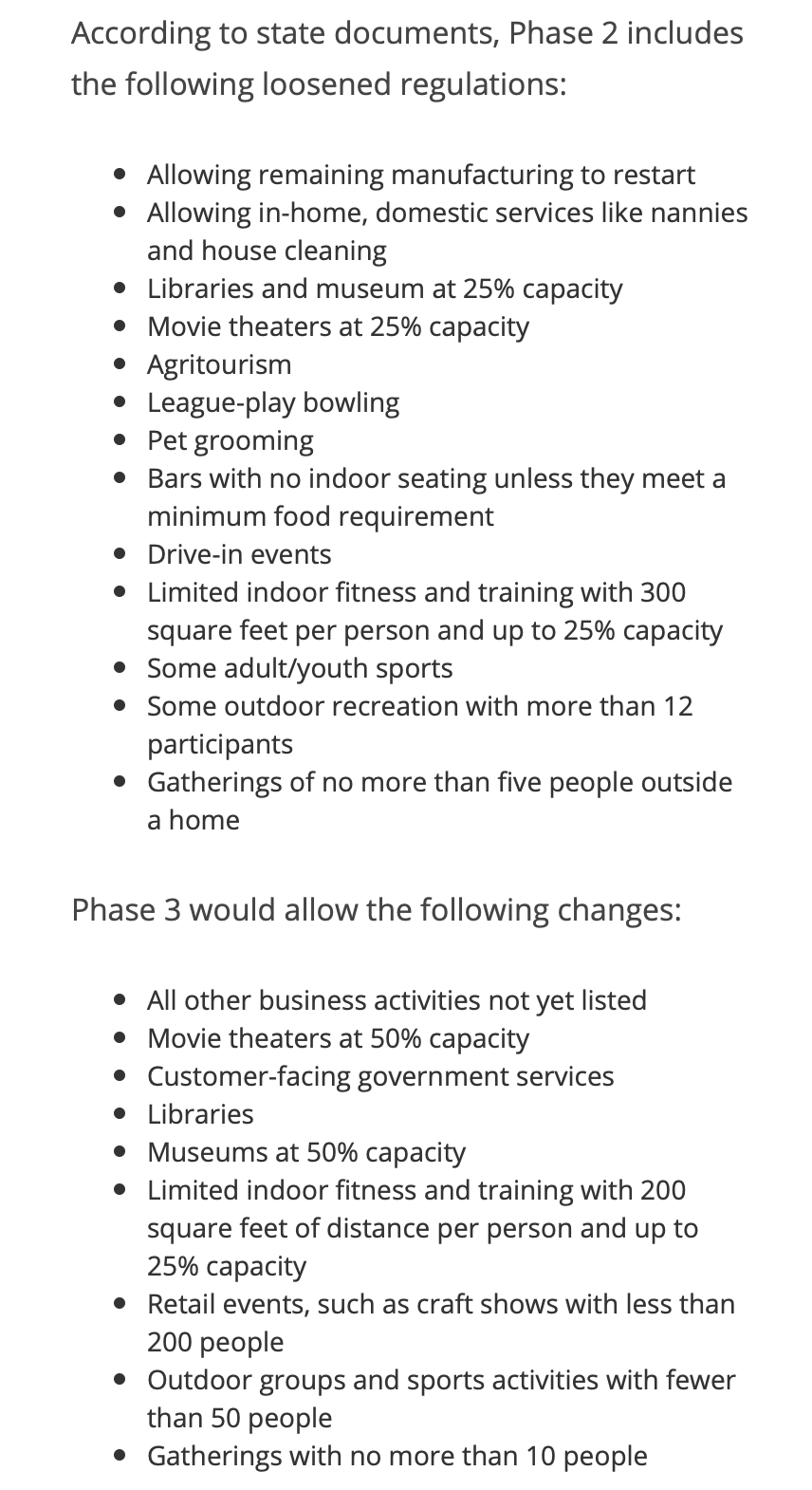 Wenatchee has been in lockdown and stuck at phase 1.5 for months due to an inability to get the virus under control. We finally received word that we could move to phase two and reopen things like the museums and library in town, which have been closed for 7 months due to COVID. This reopening means that many public services like computer use at the library and wifi for those who do not have access to it at home will be open and able to be used by those that need it. It is an important to compare where we are at to other places that moved into new phases much quicker, some of which had spikes because of it. I personally have not been able to leave and have been stuck at my house for months. I used to go to the library three times a week for school and to get out of my house but with a pandemic, I have been spending more time inside. I do not feel comfortable enough to go to the library yet, but am excited that the option is now there. Back to normal is still not an option though, and I worry that this will cause more cases in my area. This whole experience has been eye opening for how much I did unplanned, now I have to plan everything I do so I can keep myself and my family safe.