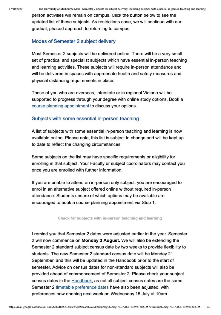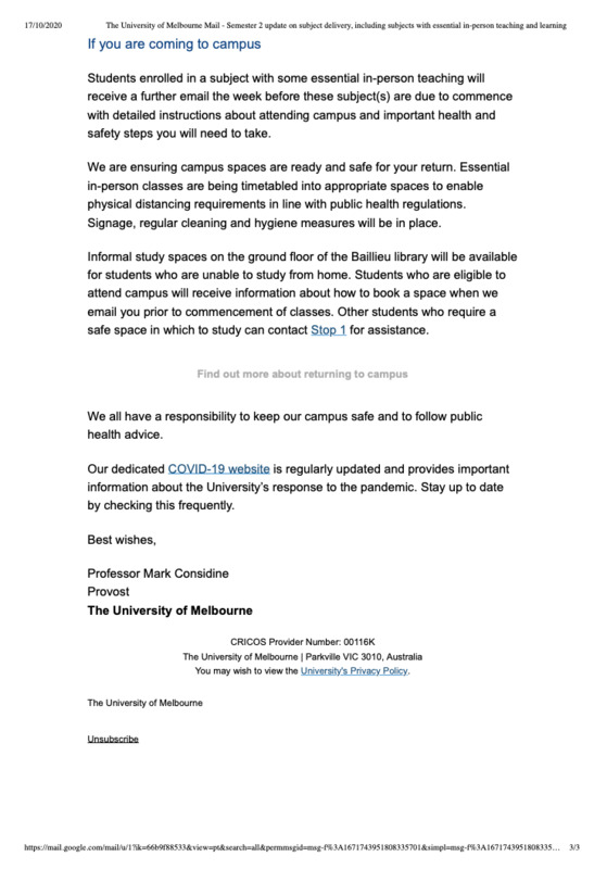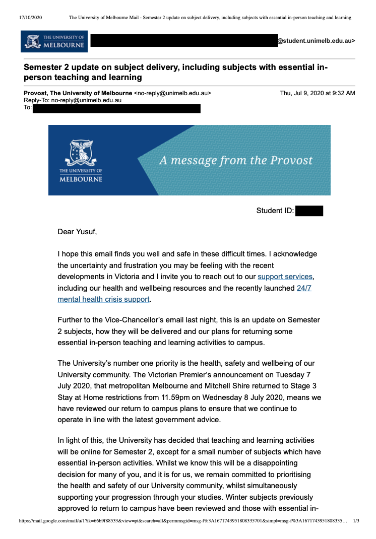 Email (sent to me by the University of Melbourne) and chart of Covid-19 cases in Victoria, Australia (from the Australian Department of Heath and Human Services).