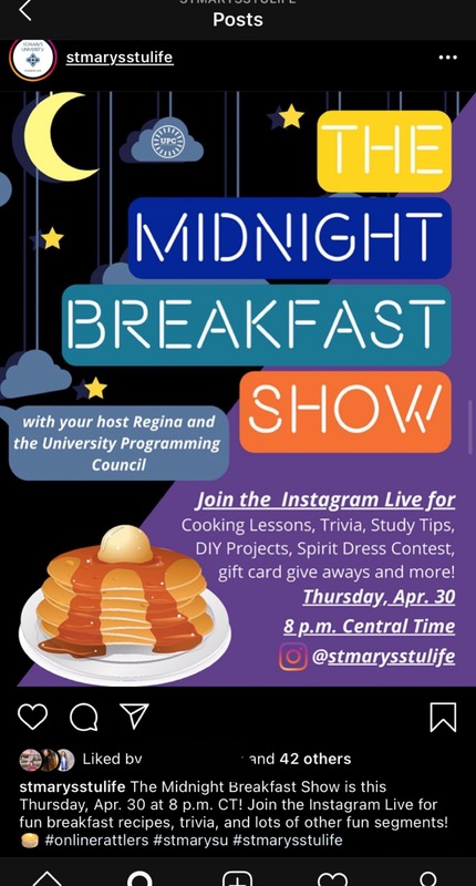 The post is on the St Mary’s student life Instagram page and contains an image of an electronic flyer/bulletin announcement. It is a post to announce an Instagram live stream for St. Mary’s students where there will be cooking lessons, trivia, study tips, DIY projects, Spirit Dress contest, gift cards giveaways and more. Just like how St. Mary's students would use this platform to announce things such a trivia night at the pub on campus, they began to use it to announce online events. This item shows how universities and organizations have had to adapt in order to keep going with their extracurricular activities and traditions that students look forward too. They have always worked hard to keep the student entertained and give them things to do outside of class, however, with COVID, they've had to be more creative and think of activities to do on any online platforms such as Zoom, or in this case, an Instagram live stream. In the end, it is important to try and keep the fun activities and traditions alive and going so that the students can feel as though, even though things are being done on online platforms instead of in person like before, their academic years are still filled with the exiting activities and things they love about being a student.