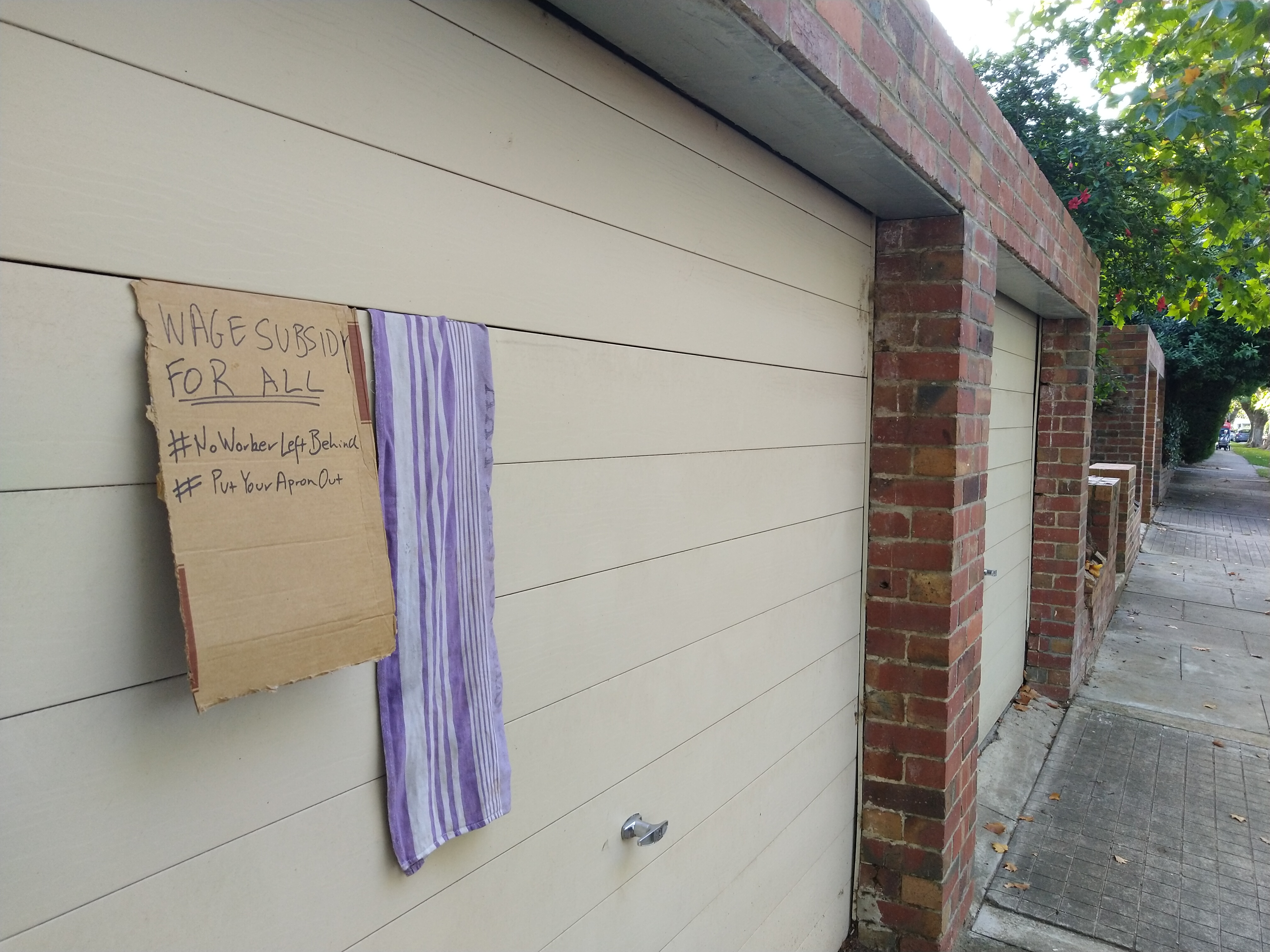 Text reads: WAGE SUBSIDY FOR ALL #NoWorkerLeftBehind #PutYourApronOut
