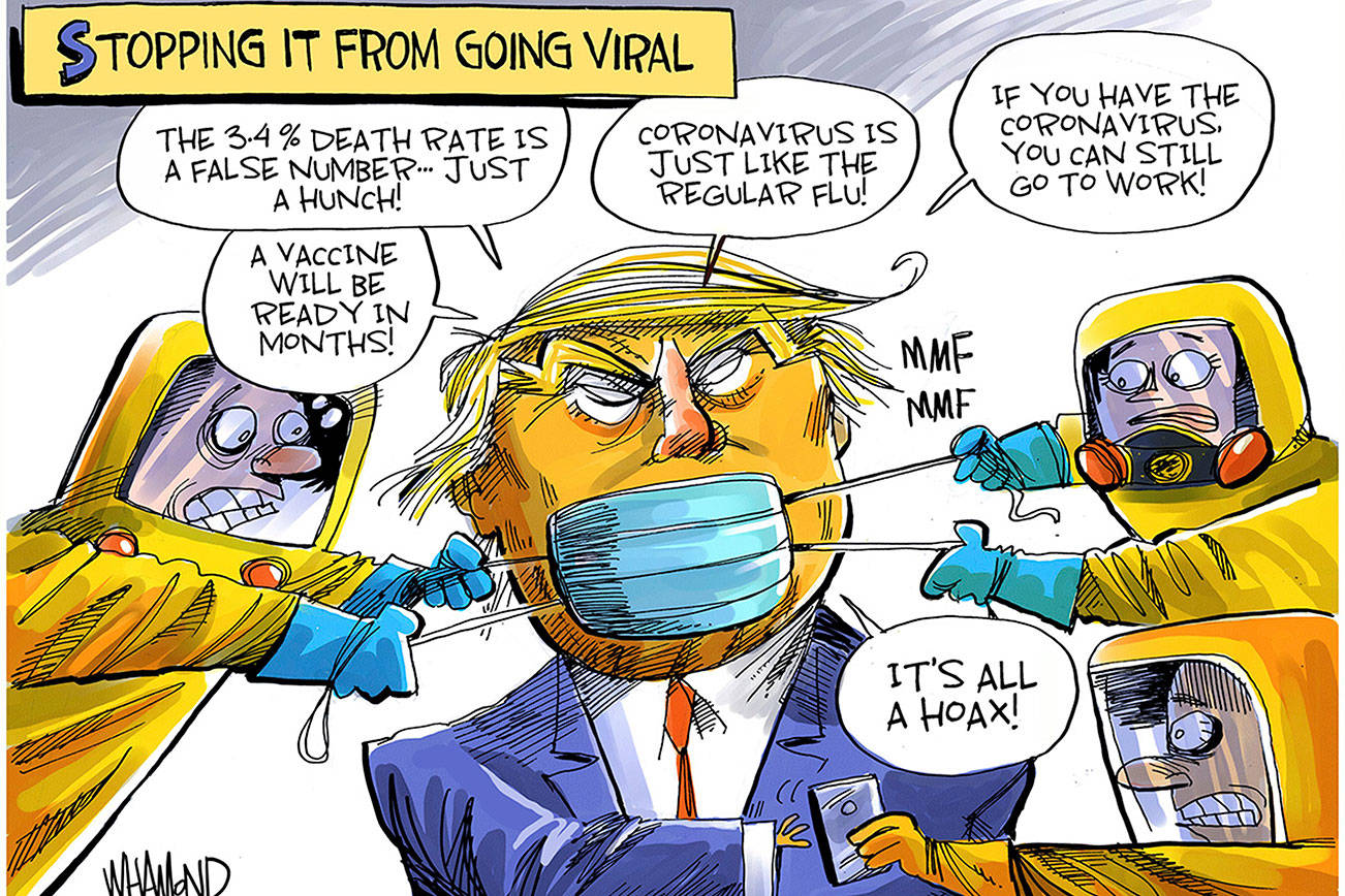 Finding any type of media that will accurately show what little the government has done and the lack of support the people of America have is unbelievably easy. In fact, I had a hard time choosing between which cartoon illustration was better. I knew our government wasn’t perfect, but it wasn’t until Donald Trump being elected and the coronavirus pandemic hitting our homes did I realize how terrible things really are. These cartoons depicted so well how our government has harmed us more than helped us. The dangerous lies told by our own president and how the government won't take responsibility. When corona made its way to the U.S it was deemed unserious. On March 11th, 2020, President Trump said, “The vast majority of Americans, the risk is very, very low.” At that time there were 1,105 cases and 33 deaths documented in the U.S. The next day my highschool as well as every other school within the country closed down as an “extra week of spring break” due to the virus. This “break” soon became eight months and in the U.S alone there are now 8,128,524 ( plus 47,035 new) cases with 218,986 ( plus 475 new) deaths . The scare became real, people started stocking up leaving nothing for anyone else. We have almost 15 people in our home, it took my mom multiple trips to different stores in order to get the necessities for our family. You would think when a pandemic is spreading throughout people in the country you were placed in position to protect you’d address the problem seriously and work hard to find a solution. All Trump and our government has done was ignore the citizens deaths and provide false hope. What we did get was our president being sarcastic and telling us to inject lysol into our lungs. The citizen’s of America have seen other countries rise in numbers of coronavirus with us and then watch their governments actually handle the situation causing their numbers to decline while our numbers are still shooting through the roof. The panic of this virus does not even cross the mind of those who are rich, the group that our current president only cares about. They didn’t have to worry about medical bills in a country where the president doesn’t believe free healthcare is a human right because they know they are important in his eyes. At the end of this virus, it will be the stories from the one percent belittling the destruction of this virus rather than those who have actually suffered. America is running on ignorance right now. Our own president and government is not concerned with the health of the country. It is the government's job to protect and provide for its people, whether it be an outside threat or a threat within the country. When I look at those cartoons of Donald Trump and the coronavirus, it makes me remember how badly I want our country to actually function the way it is intended to.
