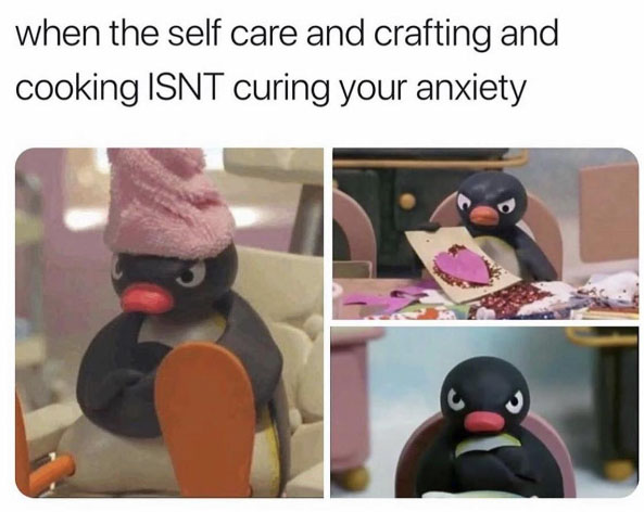 Everyone has different approaches against anxiety during Covid, from self-care to cooking and exercising. Everyone has an opinion about it, everyone has a miraculous solution. Personally, I have tried many things: watching a movie, diet, moving furniture, cleaning, etc... Sometimes works and others don't. The meme that I chose reflects how anxiety is not a simple problem that can be fixed with a time-out. Anxiety can be a serious health condition and not every advice works the same in every person. Also, we need to consider accessibility to health, the possibility for self-care, healthy food, time for exercise, etc...Not everyone has the economical stability for self-care. Is easy to say to take a warm bath, drink some wine, and forget about everything. Think about all that priority workers that are exposing themselves to keep our daily lives working. Think of nurses, doctors, teachers, immigrant farmworkers, among many others.