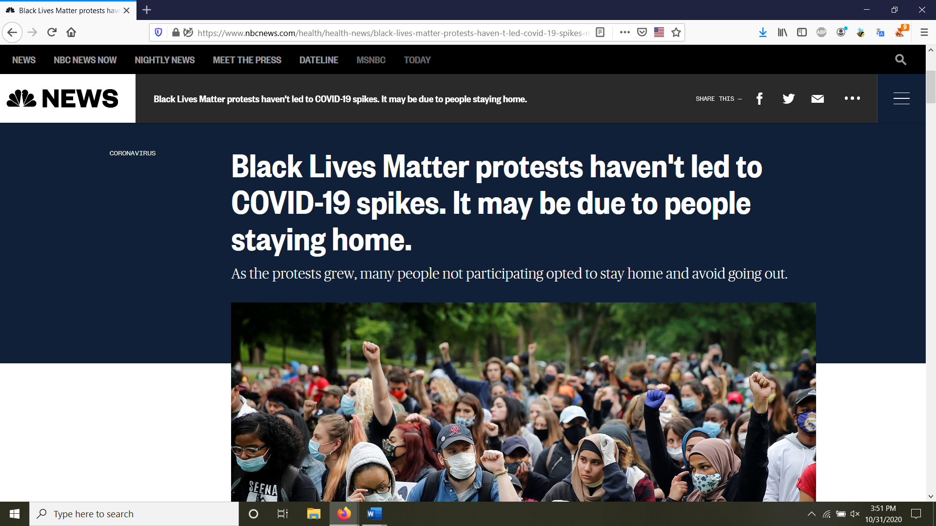 I found this news article in June. I was scrolling through a variety of news articles on my phone when I happened across this one discussing if there was a link between Black Lives Matter protests and Coronavirus spikes. I remember being intrigued by this article because I saw online arguments from anti-BLM individuals stating that now is not the time to protest and protestors are spreading the virus faster. I found this news article insightful and important because Black Lives Matter gained momentum three months into the United States shutdown. Since the two events happened around the same time and there appeared to be misinformation spread by individuals, I found it helpful to stick to news outlets.