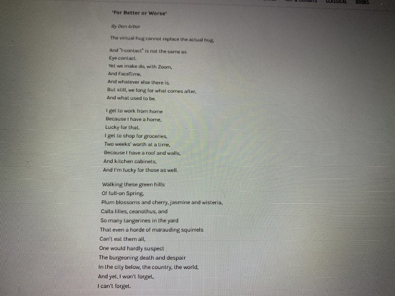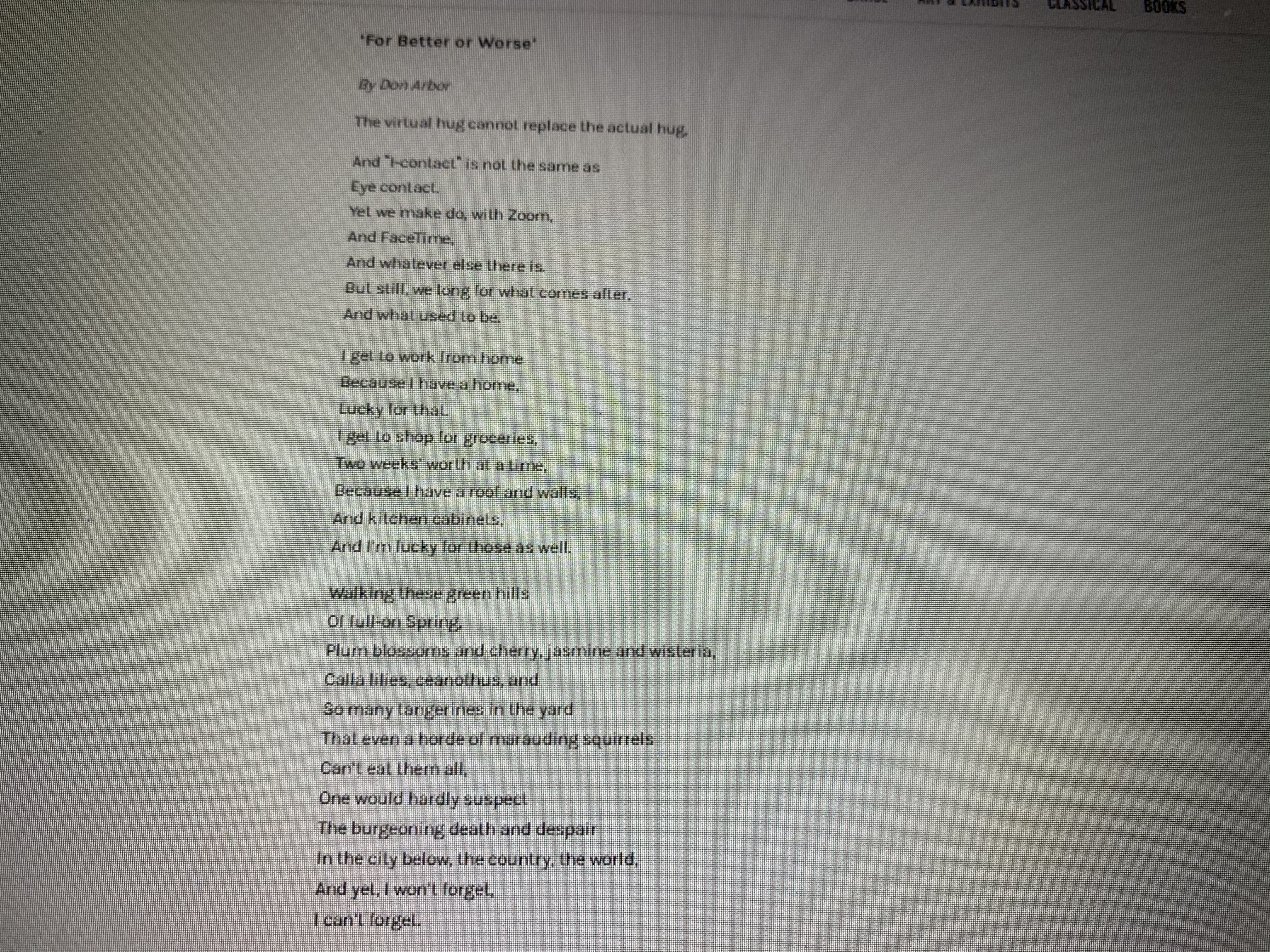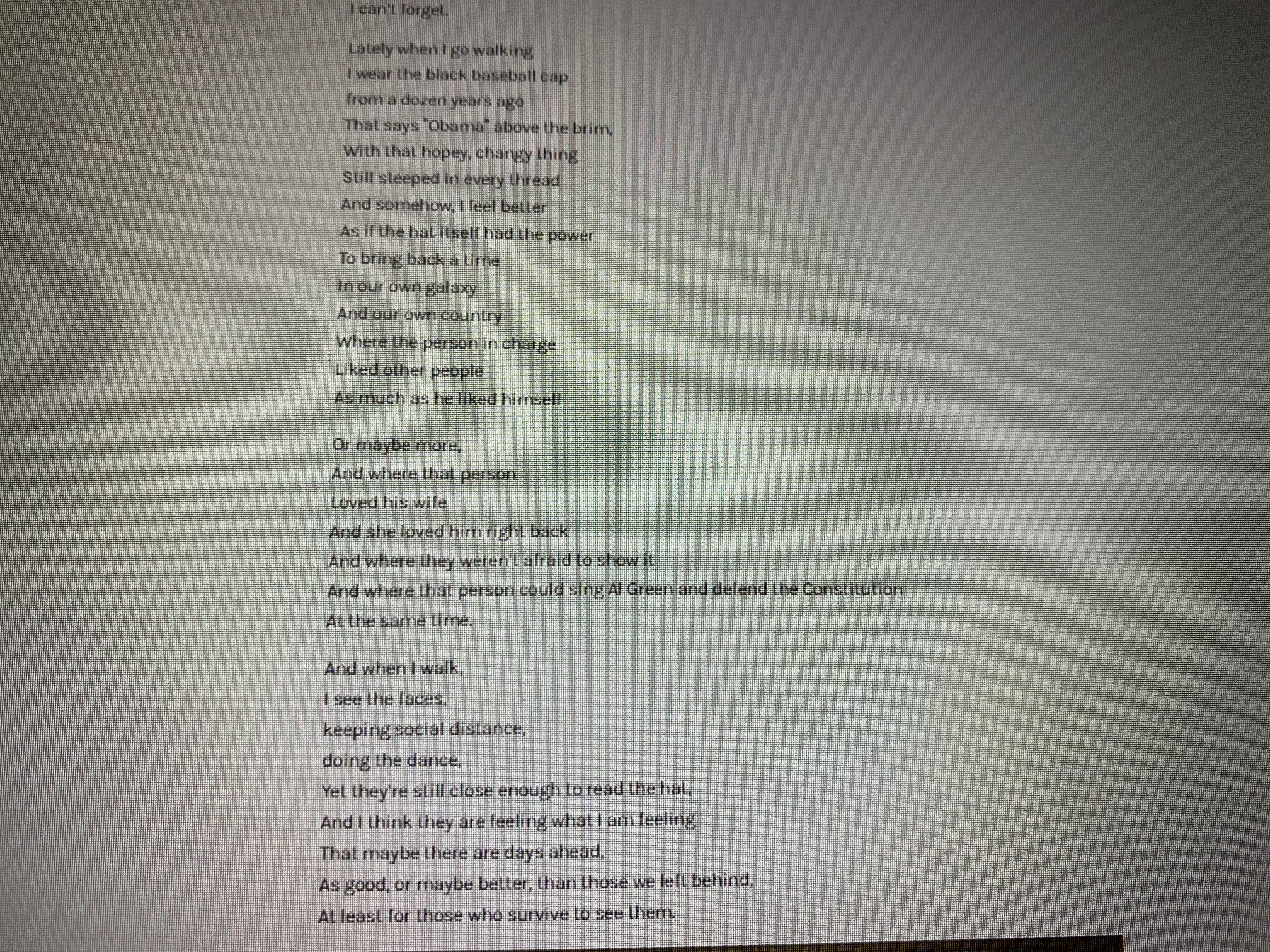 When I read this poem by Don Arbor called “For Better or Worse”, I instantly felt connected because we all are facing the same problems throughout this pandemic. We feel the need to stay home and stay away from others but are able to still virtually be there for one another. We might not be able to experience life in the same aspect as we use to, but we have to expect for better days to come. One thing that stuck out was how he was still able to appreciate what he has in this exact moment instead of being negative. He states that he is grateful and lucky, but he will never be able to forget something so disheartening. In the fourth stanza all the way to the end, he starts to get into politics and describes how things were a few yeas ago when Obama was president. Don Arbor discusses how Obama cared about the American people just as much as he cared about himself. He was willing to stick to his morals and be active within the government compared to what is happening right now. Don believes that most individuals feel how he is feeling and that the possibility of better days are yet to come.