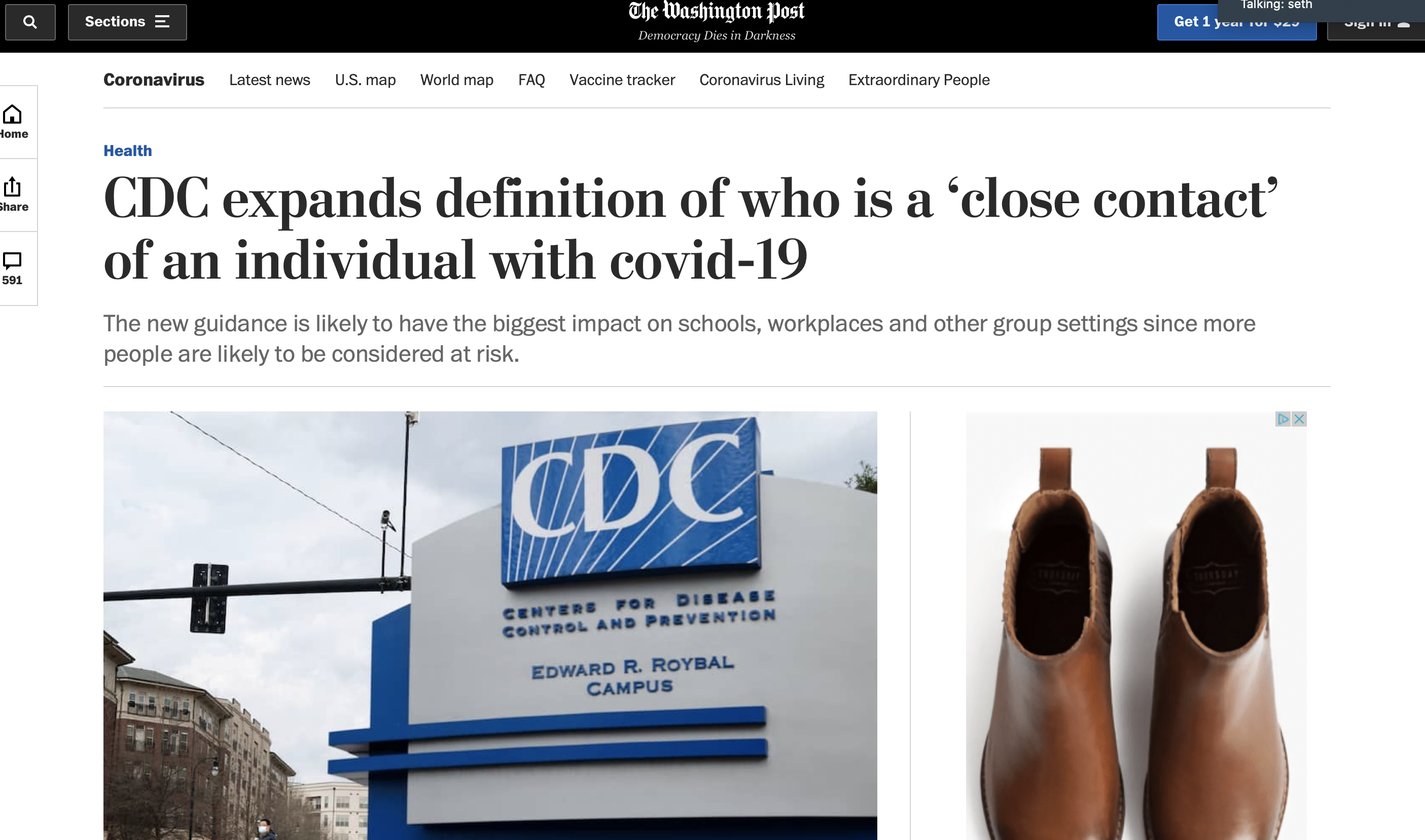 The CDC expanded its definition of "close contact." The article states, "The CDC had previously defined a “close contact” as someone who spent at least 15 consecutive minutes within six feet of a confirmed coronavirus case. The updated guidance, which health departments rely on to conduct contact tracing, now defines a close contact as someone who was within six feet of an infected individual for a total of 15 minutes or more over a 24-hour period, according to a CDC statement Wednesday."