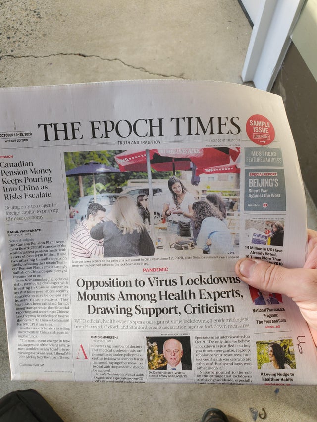 The front page literally only covers China and Covid-19 conspiracies. The Falun Gong own and run the Neo-Conservative paper. This and the Shen Yun dance trope appears to be apart of the continuous push to reach non-chinese North Americans.