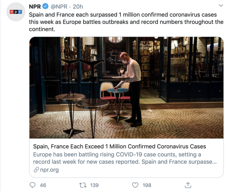 Both Spain and France reached 1 million COVID-19 cases this week. Spain was the first country in Europe to reach a million and France followed only a day later. This came as a result of the spike in Europe's cases in the past few weeks.