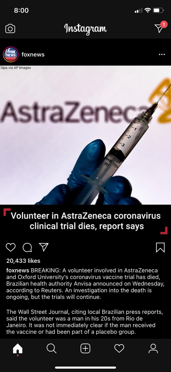 Like most people this day and age I get my news primarily from social media. I also watch the news (both FOX and CNN, just to get some sort of truth) but I was stopped in my tracks when I saw this story. I would have expected a downfall in vaccine trials to be reported by CNN or a democratic news outlet but this came straight from the republic horse’s mouth – Fox news. On the topic of vaccines, it seems that most republicans are not only eager for a vaccine but ready to get one, many democrats are a little more stand-offish about it. I stand somewhere in the middle; I look forward to a vaccine but want it backed by science not only the president. This story by FOX news talks about a volunteer in vaccine trials and how they died. It doesn’t discuss if the volunteer was administered medication or a placebo but it still make me wonder about a potential vaccine and its effectiveness.