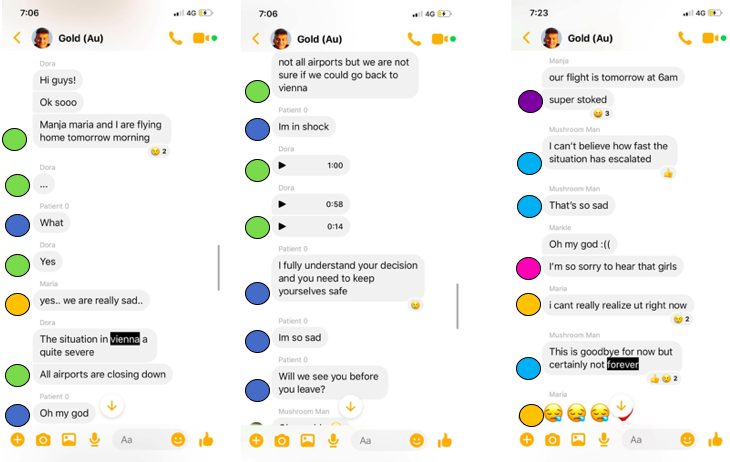 I was on exchange in Edinburgh in the first half of 2020, and was forced to return home early because of COVID-19. These messages show 3 of my friends announcing in a Facebook group chat that they were heading home to Austria, which came as a huge surprise to the rest of us in the group. This was a sad, confusing, disorienting moment, which these messages demonstrate.