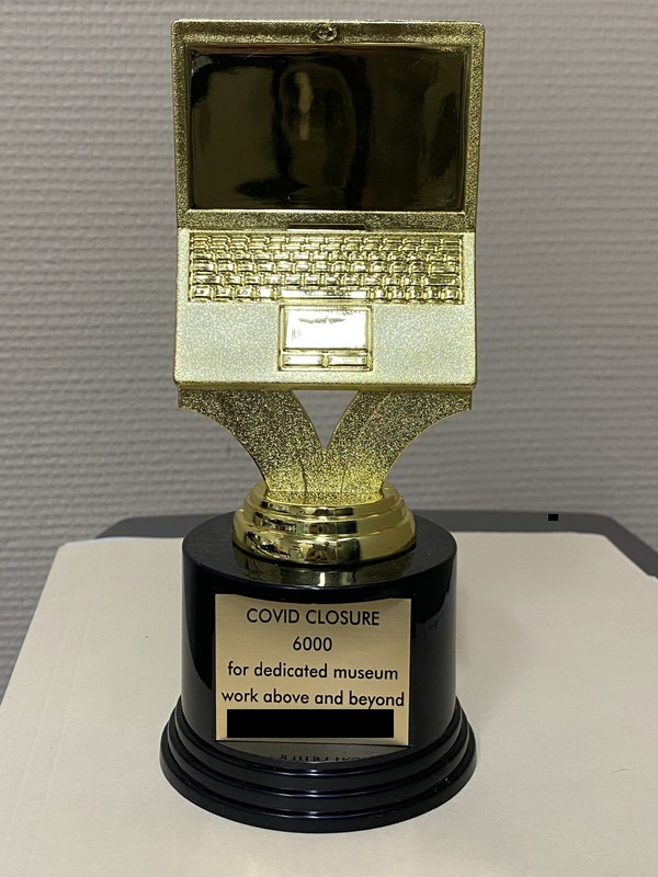 Photograph of a gift award given by another museum manager to recognize efforts of the collections team for entering 6,000 records when working from home.